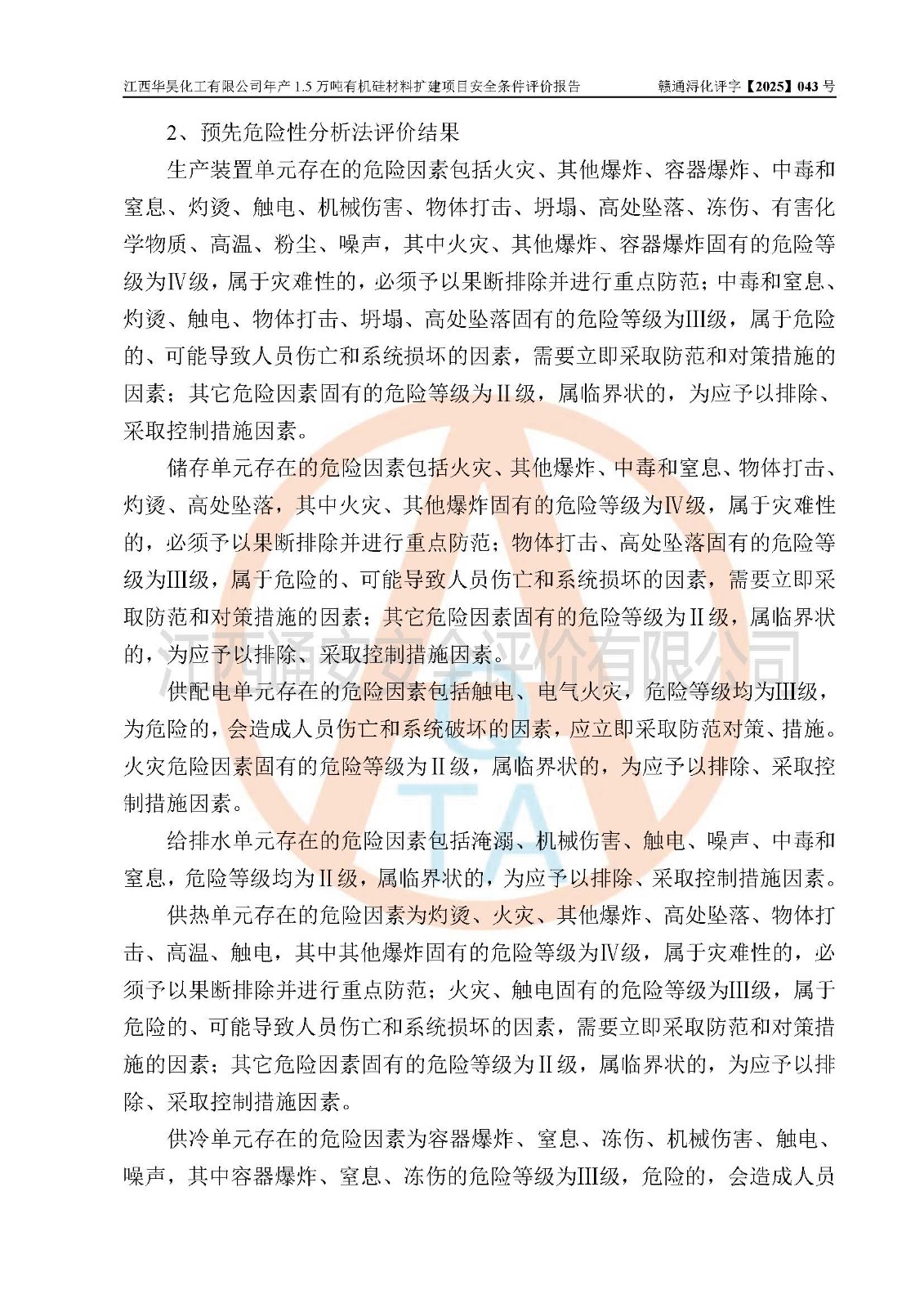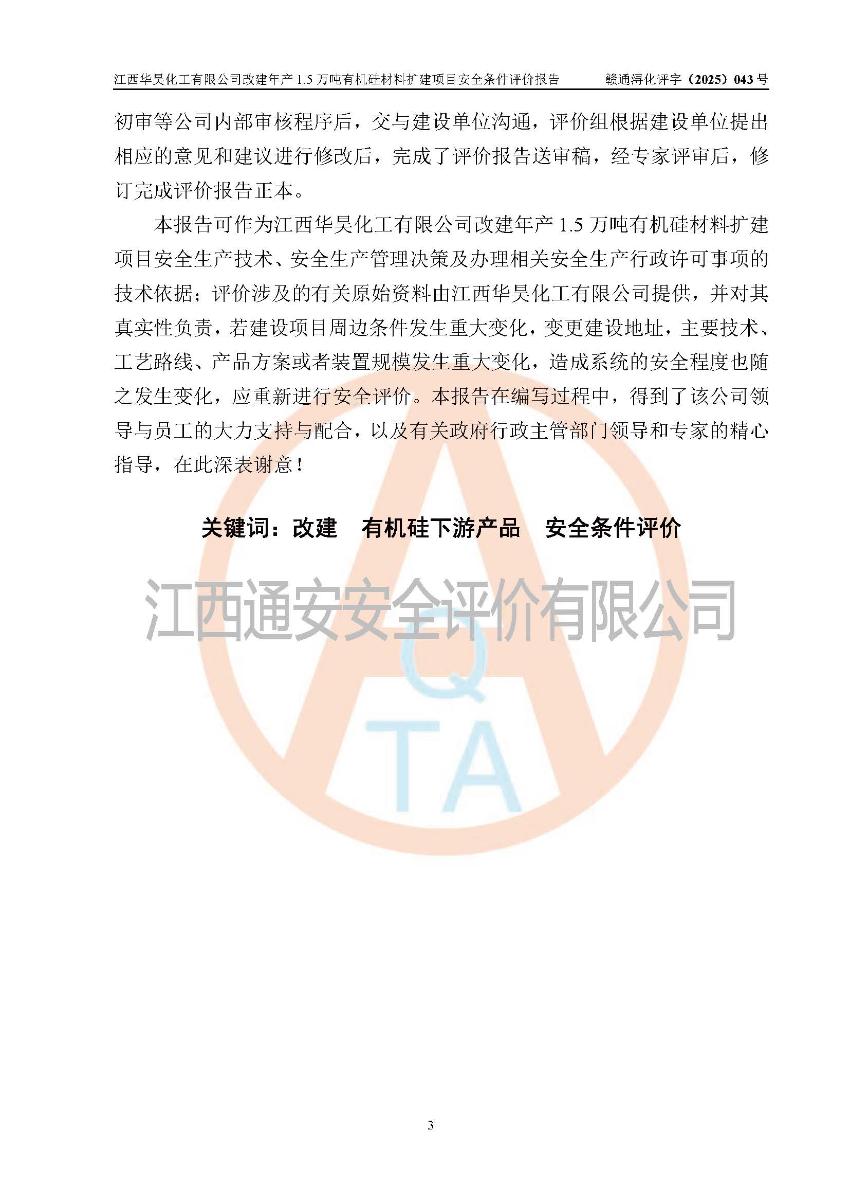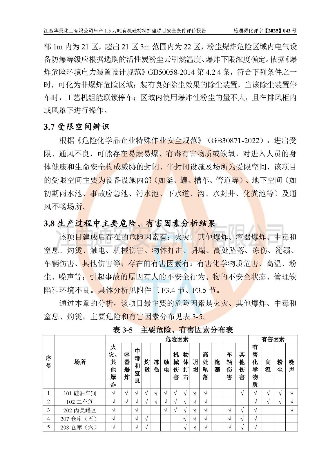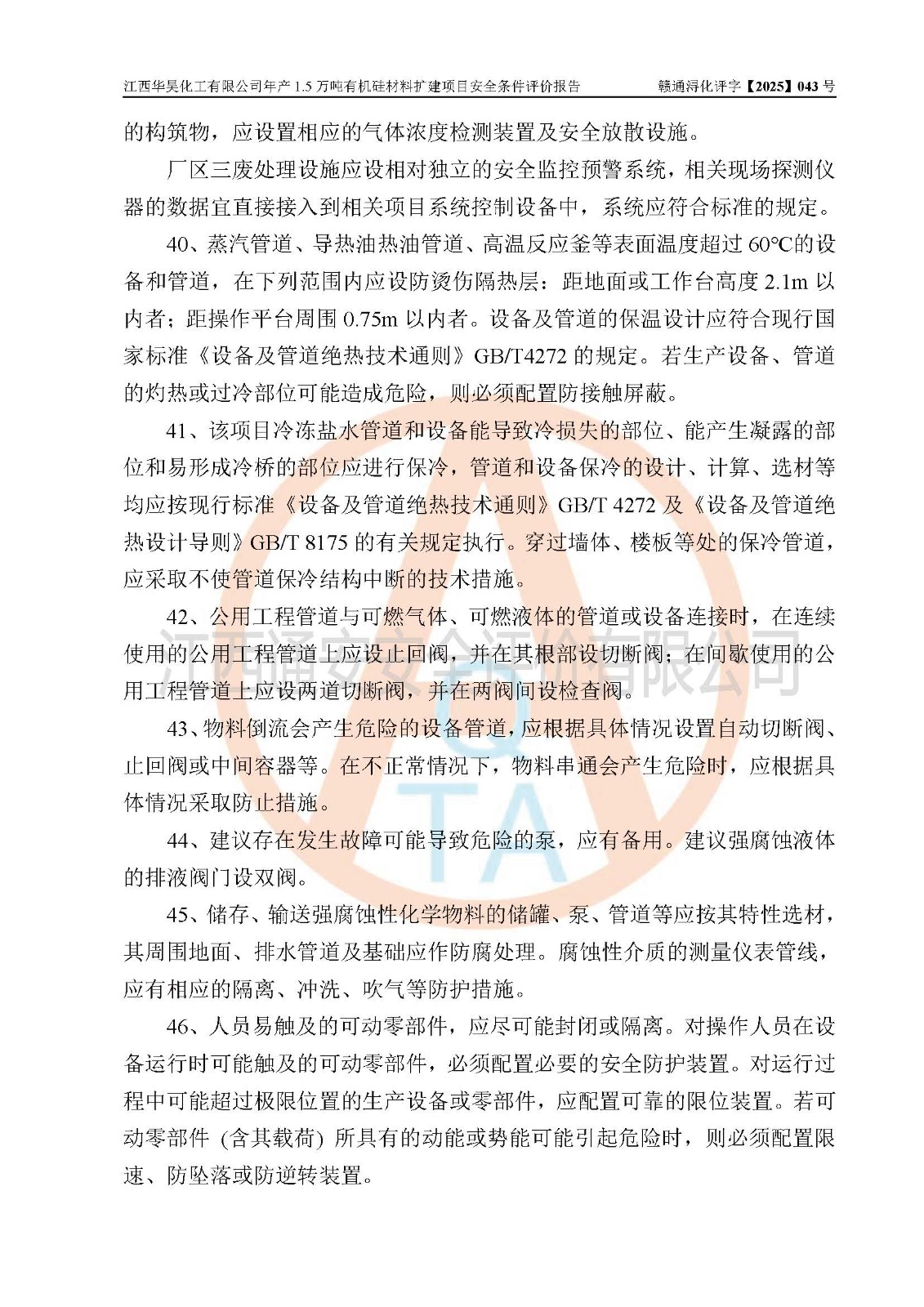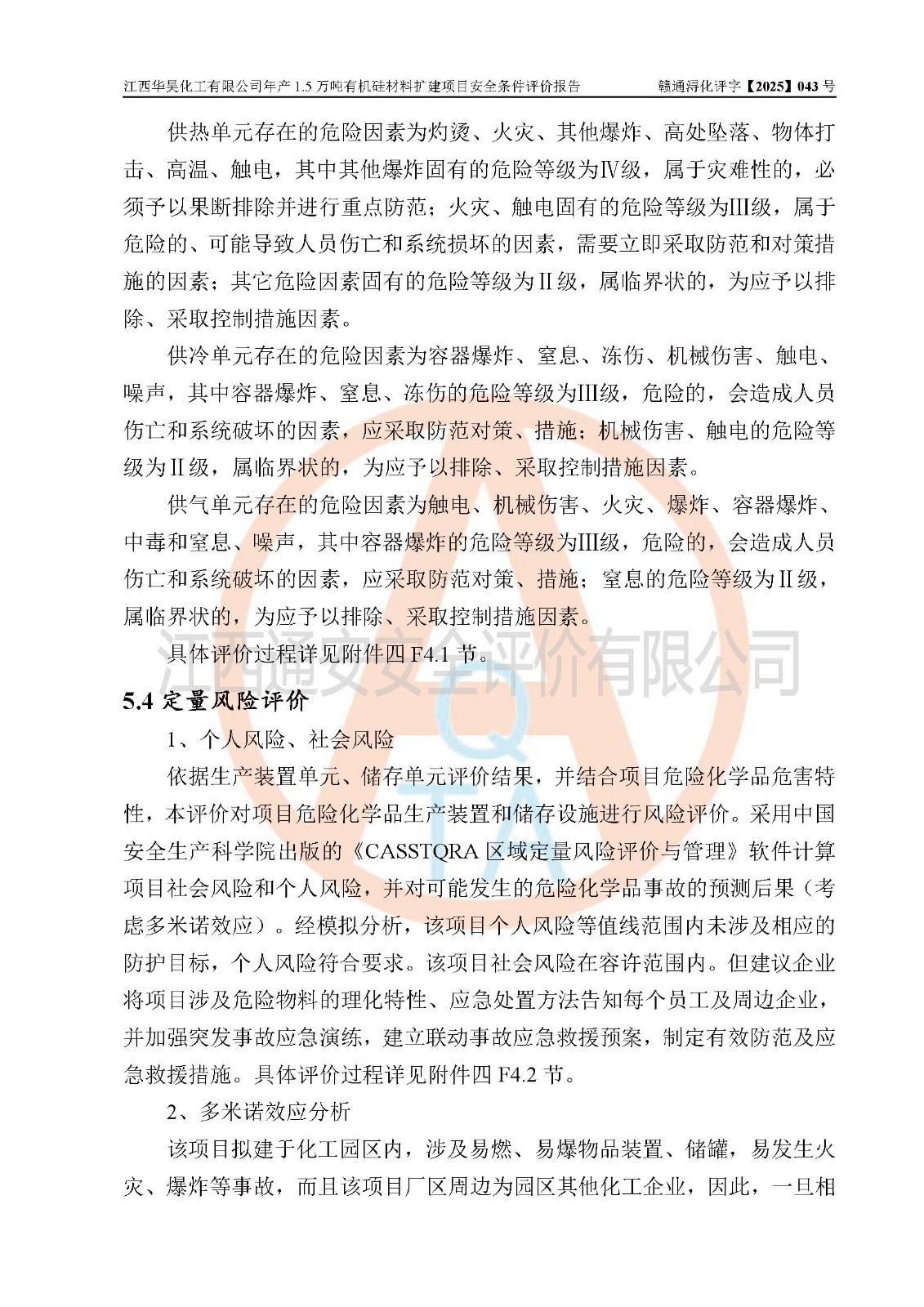 江西華昊化工有限公司是一家于2011年11月注冊成立的有限責(zé)任公司(自然人投資或控股),注冊地址位于永修縣云山經(jīng)濟(jì)開發(fā)區(qū)星火工業(yè)園星云大道旁,法定**人柴利兵,注冊資本1542萬元,經(jīng)營范圍包括許可項(xiàng)目和一般項(xiàng)目,許可項(xiàng)目為危險(xiǎn)化學(xué)品生產(chǎn)、危險(xiǎn)化學(xué)品經(jīng)營、貨物進(jìn)出口、第二類醫(yī)療器械生產(chǎn),一般項(xiàng)目為合成材料制造(不含危險(xiǎn)化學(xué)品)、合成材料銷售、第二類醫(yī)療器械銷售。 為滿足更大市場需求,同時(shí)解決企業(yè)原料及配套生產(chǎn)的需求,江西華昊化工有限公司擬投資5000萬元將廠區(qū)101硅油車間、102二車間原有項(xiàng)目改建為年產(chǎn)1.5萬噸有機(jī)硅材料擴(kuò)建項(xiàng)目(以下簡稱“該項(xiàng)目”)。 該項(xiàng)目生產(chǎn)過程涉及的化學(xué)反應(yīng)包括聚合(常壓)、水解、中和,涉及蒸餾、壓濾、流體輸送、熱交換、產(chǎn)品包裝等化工單元操作過程。該項(xiàng)目涉及的危險(xiǎn)化學(xué)品包括四甲基氫氧化銨、氫氧化鉀、磷酸、30%氫氧化鈉溶液、六甲基二硅氧烷、乙醇、氯化氫、鹽酸、氮?dú)?/span>、DMC(二甲基環(huán)硅氧烷的混合物)、有機(jī)硅單體高沸物、**胺(廢氣組分)、甲醇(廢氣組分)、甲醚(廢氣組分),其中甲醇、甲醚屬于重點(diǎn)監(jiān)管的危險(xiǎn)化學(xué)品,鹽酸屬于第三類易制毒化學(xué)品,乙醇、甲醇、甲醚屬于特別管控危險(xiǎn)化學(xué)品,四甲基氫氧化銨、乙醇、**胺、甲醇、甲醚屬于第四類監(jiān)控化學(xué)品。該項(xiàng)目不涉及劇毒品、易制爆化學(xué)品、高毒物品,不涉及**、二、三類監(jiān)控化學(xué)品。 該項(xiàng)目不涉及重點(diǎn)監(jiān)管的典型危險(xiǎn)化工工藝,生產(chǎn)單元、儲存單元不構(gòu)成危險(xiǎn)化學(xué)品重大危險(xiǎn)源。 該項(xiàng)目副產(chǎn)品鹽酸、中間產(chǎn)品低粘度封頭劑(六甲基二硅氧烷)屬于危險(xiǎn)化學(xué)品,該項(xiàng)目屬于危險(xiǎn)化學(xué)品生產(chǎn)項(xiàng)目,依據(jù)《危險(xiǎn)化學(xué)品生產(chǎn)企業(yè)安全生產(chǎn)許可證實(shí)施辦法》(**安全生產(chǎn)監(jiān)督管理總局令第41號,第79號、89號修改),項(xiàng)目需要辦理危險(xiǎn)化學(xué)品安全生產(chǎn)許可證。 |