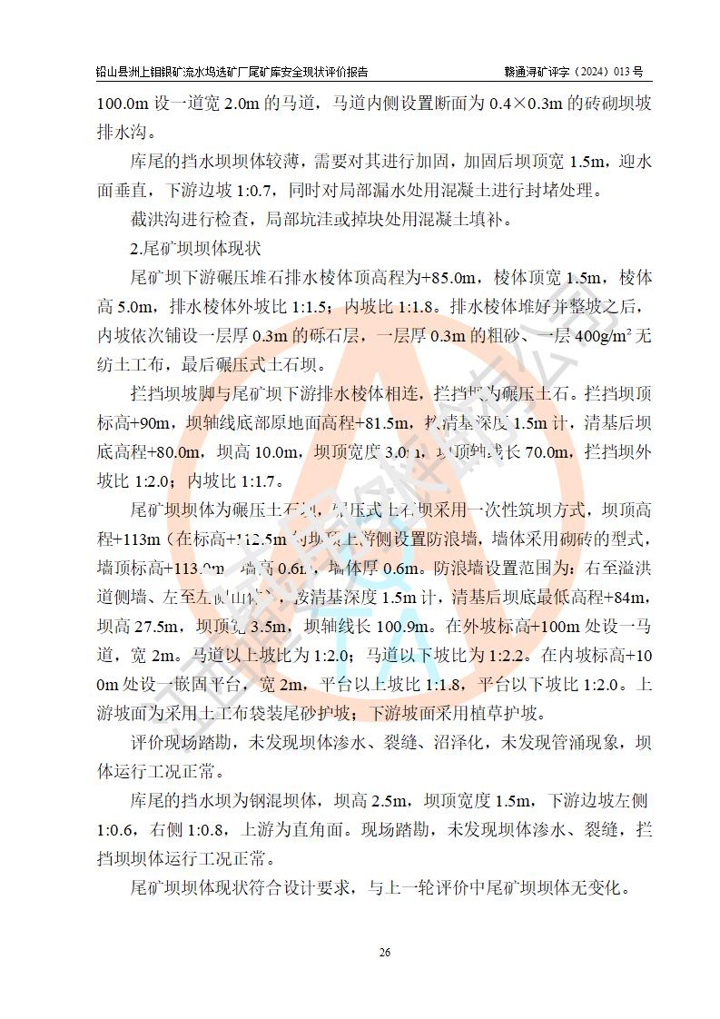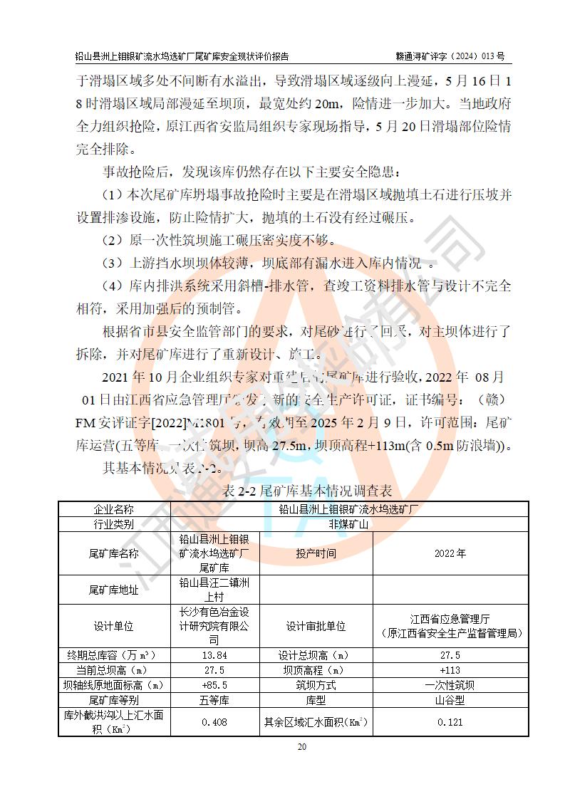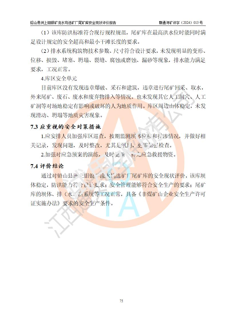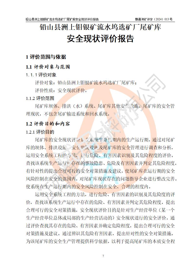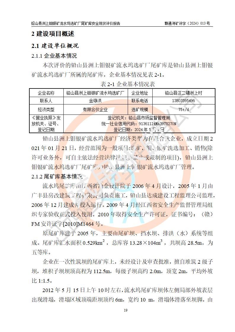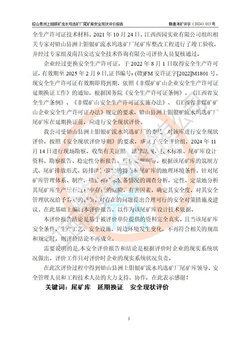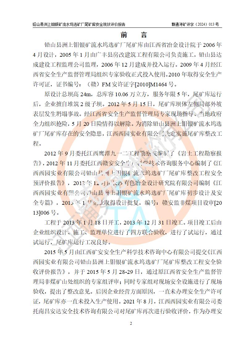 報(bào)告名稱 | 鉛山縣洲上鉬銀礦流水塢選礦廠尾礦庫(kù)安全現(xiàn)狀評(píng)價(jià)報(bào)告 | ||||||
