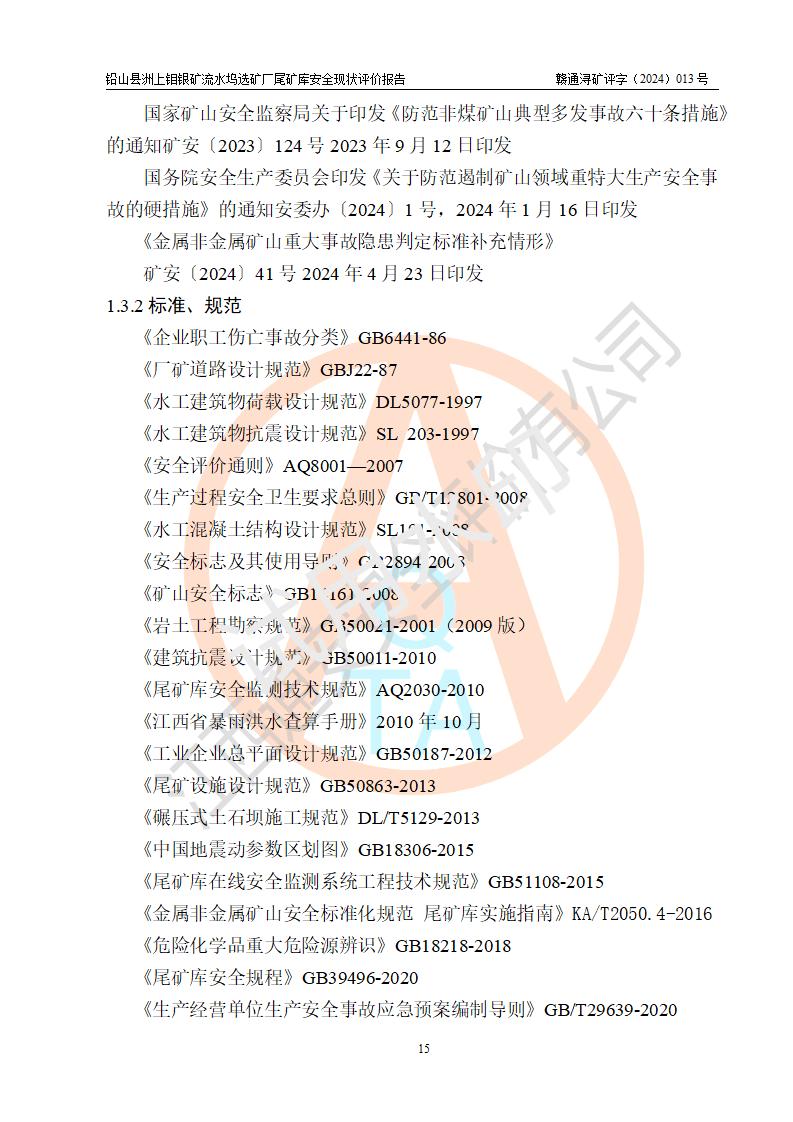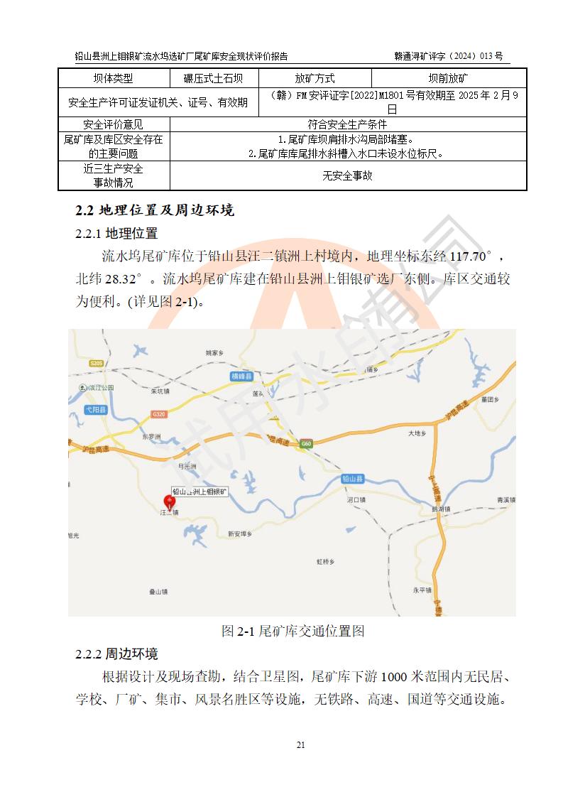項(xiàng)目簡(jiǎn)介 | 鉛山縣洲上鉬銀礦流水塢選礦廠尾礦庫(kù)由江西省冶金設(shè)計(jì)院于2006年4月設(shè)計(jì),2005年1月由廣豐縣房改建筑工程有限公司負(fù)責(zé)施工,鉛山縣達(dá)成建設(shè)工程監(jiān)理公司監(jiān)理,2006年12月建成并投入運(yùn)行。2009年4月經(jīng)江西省安全生產(chǎn)監(jiān)督管理局組織專家驗(yàn)收正式投入使用。2010年取得安全生產(chǎn)許可證,證書(shū)編號(hào):(贛)FM安許證字[2010]M1464號(hào)。 原設(shè)計(jì)總壩高24m,總庫(kù)容10.06萬(wàn)立方,服務(wù)年限5年,尾礦庫(kù)運(yùn)行后,企業(yè)擅自堆筑2級(jí)子壩。2012年5月15日,尾礦庫(kù)壩體左側(cè)局部外坡表層發(fā)生坍塌事故。經(jīng)江西省安全生產(chǎn)監(jiān)督管理局專家現(xiàn)場(chǎng)指導(dǎo)、當(dāng)?shù)?*全力組織搶險(xiǎn),5月20日險(xiǎn)情得以解除。為消除鉛山縣洲上鉬銀礦流水塢選礦廠尾礦庫(kù)存在的安全隱患,江西西園實(shí)業(yè)有限公司決定實(shí)施尾礦庫(kù)整改工程。 2012年9月委托江西鷹潭九一二工程勘察院編制了《巖土工程勘察報(bào)告》,2012年11月委托江西贛安安全生產(chǎn)科學(xué)技術(shù)咨詢服務(wù)中心編制了《江西西園實(shí)業(yè)有限公司鉛山縣洲上鉬銀礦流水塢選礦廠尾礦庫(kù)整改工程安全預(yù)評(píng)價(jià)報(bào)告》,2012年12月由長(zhǎng)沙有色冶金設(shè)計(jì)研究院有限公司編制《江西西園實(shí)業(yè)有限公司鉛山縣洲上鉬銀礦流水塢選礦廠尾礦庫(kù)初步設(shè)計(jì)及安全專篇》,2013年1月企業(yè)取得設(shè)計(jì)批復(fù),編號(hào):贛安監(jiān)非煤項(xiàng)目設(shè)審[2013]006號(hào)。 工程于2013年1月18日開(kāi)工,2013年12月31日竣工。項(xiàng)目竣工后由企業(yè)組織設(shè)計(jì)、施工、監(jiān)理單位進(jìn)行了四方聯(lián)合驗(yàn)收,進(jìn)行了試運(yùn)行,通過(guò)試運(yùn)行,尾礦庫(kù)運(yùn)行工況良好。 2015年5月由江西礦安安全生產(chǎn)科學(xué)技術(shù)咨詢中心有限公司提交《江西西園實(shí)業(yè)有限公司鉛山縣洲上鉬銀礦流水塢選礦廠尾礦庫(kù)整改工程安全驗(yàn)收評(píng)價(jià)報(bào)告》,并于2015年5月28-29日,通過(guò)原江西省安全生產(chǎn)監(jiān)督管理局非煤礦山處組織的專家組評(píng)審;同時(shí)專家組對(duì)現(xiàn)場(chǎng)安全設(shè)施進(jìn)行了現(xiàn)場(chǎng)驗(yàn)收,提出了整改意見(jiàn)。后因企業(yè)經(jīng)營(yíng)方面原因,一直未辦理安全生產(chǎn)許可證,尾礦庫(kù)亦一直未投入生產(chǎn)使用。2021年8月,江西西園實(shí)業(yè)有限公司委托南昌安達(dá)安全技術(shù)咨詢有限公司對(duì)尾礦庫(kù)再次進(jìn)行驗(yàn)收評(píng)價(jià),作為辦理安全生產(chǎn)許可證技術(shù)材料。2021年10月24日,江西西園實(shí)業(yè)有限公司組織相關(guān)專家對(duì)鉛山縣洲上鉬銀礦流水塢選礦廠尾礦庫(kù)整改工程進(jìn)行了竣工驗(yàn)收,并經(jīng)過(guò)專家組及南昌安達(dá)安全技術(shù)咨詢有限公司評(píng)價(jià)人員復(fù)核通過(guò)。 企業(yè)經(jīng)過(guò)更換安全生產(chǎn)許可證,于2022年8月1日取得安全生產(chǎn)許可證,**期至2025年2月9日,證書(shū)編號(hào):(贛)FM安許證字[2022]M1801號(hào)。現(xiàn)安全生產(chǎn)許可證**期即將到期,依照《非煤礦礦山企業(yè)安全生產(chǎn)許可證延期換證工作》的通知,根據(jù)***《安全生產(chǎn)許可證條例》、《江西省安全生產(chǎn)條例》、《非煤礦山安全生產(chǎn)許可證實(shí)施辦法》、《江西省非煤礦礦山企業(yè)安全生產(chǎn)許可證辦法》規(guī)定的要求,鉛山縣洲上鉬銀礦流水塢選礦廠尾礦庫(kù)在延期換證前,應(yīng)進(jìn)行安全現(xiàn)狀評(píng)價(jià)。 | ||||||