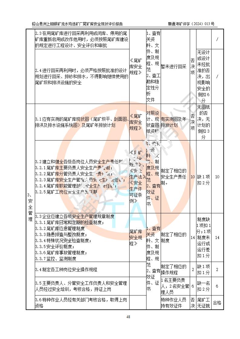 評(píng)價(jià)結(jié)論 | 通過(guò)對(duì)鉛山縣洲上鉬銀礦流水塢選礦廠尾礦庫(kù)的安全現(xiàn)狀評(píng)價(jià),該庫(kù)壩體穩(wěn)定,防洪能力符合設(shè)計(jì)要求;安全管理能夠符合安全生產(chǎn)的要求;尾礦庫(kù)的壩體、排(水)洪系統(tǒng)等工況正常,具備《非煤礦山企業(yè)安全生產(chǎn)許可證實(shí)施辦法》要求的安全生產(chǎn)條件。 | ||||||