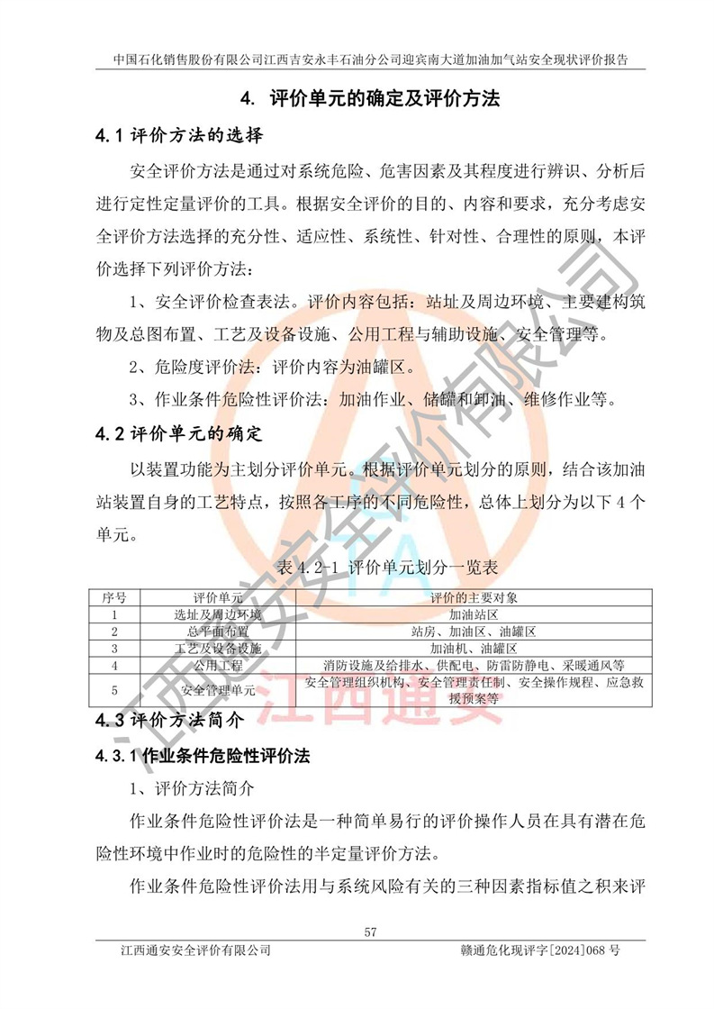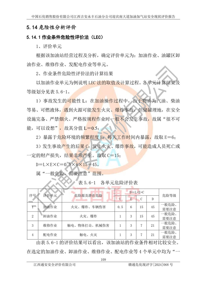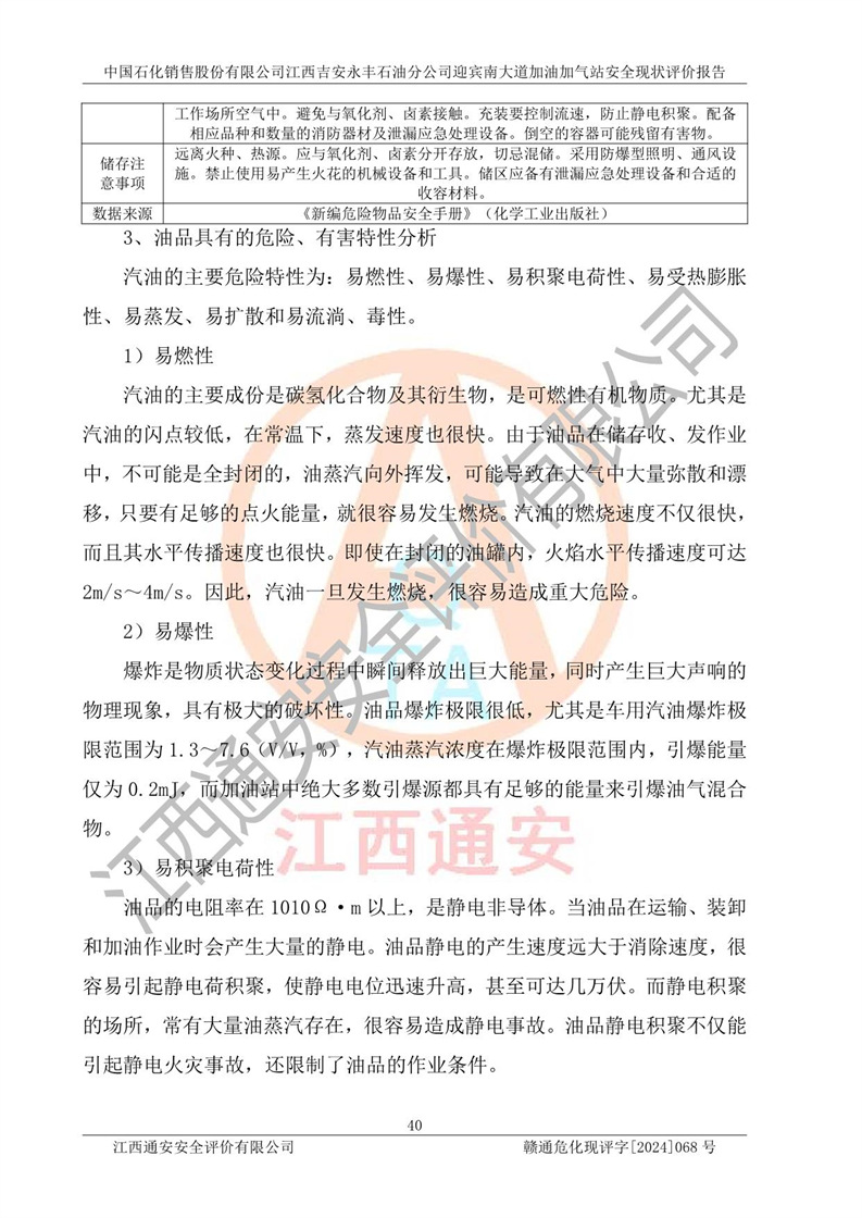 其它 | 在對該項目危險、有害因素辨識分析的基礎(chǔ)上,運用安全檢查表、預(yù)作業(yè)條件危險性分析法、危險度評價、重大事故后果分析結(jié)果等評價方法對該項目進(jìn)行了分析評價,評價結(jié)果如下: 1、該項目位于江西省吉安市永豐縣迎賓南大道,符合當(dāng)?shù)匾?guī)劃,與周邊環(huán)境的距離符合有關(guān)標(biāo)準(zhǔn)、規(guī)范的要求。 2、總圖布置分區(qū)明確,布局合理,各建構(gòu)筑物的防火間距滿足規(guī)范要求。 3、該項目無**明令淘汰的工藝,設(shè)備、設(shè)施與工藝條件、內(nèi)部介質(zhì)相適應(yīng),特種設(shè)備及設(shè)施較齊全,按規(guī)定設(shè)置防雷、防靜電接地,爆炸危險環(huán)境加油機(jī)按要求采用防爆型,符合相關(guān)標(biāo)準(zhǔn)規(guī)范要求。 5、企業(yè)設(shè)置了安全生產(chǎn)管理機(jī)構(gòu),配備了專職安全生產(chǎn)管理人員,建立了安全生產(chǎn)責(zé)任制和安全生產(chǎn)管理制度,編制了崗位操作規(guī)程,編制了生產(chǎn)安全事故應(yīng)急預(yù)案,人員經(jīng)過相應(yīng)的培訓(xùn),企業(yè)的安全生產(chǎn)管理正常。 6、作業(yè)條件危險性評價結(jié)果:在選定的評價單元中,作業(yè)危險程度均為“一般危險,需要注意”,作業(yè)條件相對安全。 7、危險度評價結(jié)果:汽油儲罐的危險程度為**危險。其設(shè)置了高液位遠(yuǎn)傳報警系統(tǒng),滲漏檢測報警系統(tǒng),埋地加油管道采用了雙層管道等,可以滿足安全生產(chǎn)條件要求。 評價結(jié)論: 中國石化銷售股份有限公司江西吉安永豐石油分公司迎賓南大道加油加氣站符合《汽車加油加氣加氫站技術(shù)標(biāo)準(zhǔn)》GB50156-2021等標(biāo)準(zhǔn)規(guī)范的要求,安全風(fēng)險可控,滿足危險化學(xué)品經(jīng)營的安全條件。 | ||||