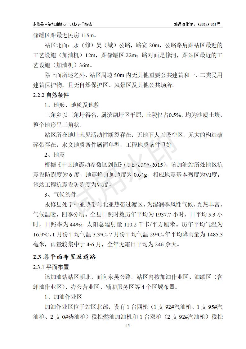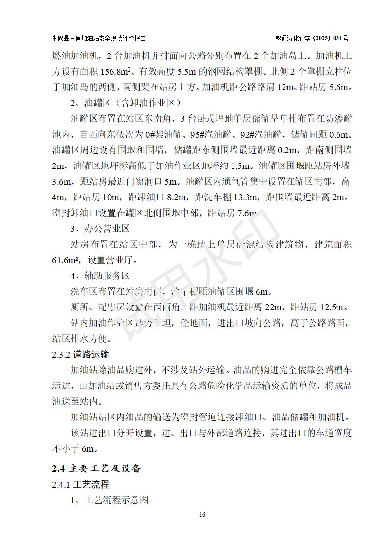 項(xiàng)目簡(jiǎn)介 | 永修縣三角加油站是一家專門從事成品油零售經(jīng)營(yíng)的個(gè)人獨(dú)資企業(yè),投資人陳淑華,經(jīng)營(yíng)場(chǎng)所位于江西省九江市永修縣三角鄉(xiāng)建華百子洲。 該加油站站區(qū)占地面積1295m2,站區(qū)內(nèi)設(shè)置有1臺(tái)四槍稅控燃油加油機(jī)和1臺(tái)雙槍稅控燃油加油機(jī)及配套的工藝管線,設(shè)有25m3的92#汽油單層儲(chǔ)罐1臺(tái)、25m3的95#汽油單層儲(chǔ)罐1臺(tái)、38m3的0#柴油單層儲(chǔ)罐1臺(tái),油品儲(chǔ)罐總?cè)莘e為88m3(折算成汽油為69m3)。按現(xiàn)行《汽車加油加氣加氫站技術(shù)標(biāo)準(zhǔn)》對(duì)加油站的等級(jí)劃分原則,該站屬于三級(jí)加油站。 | ||||