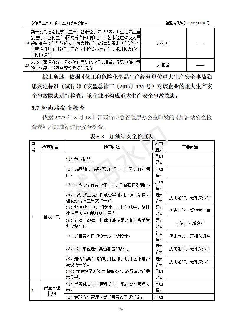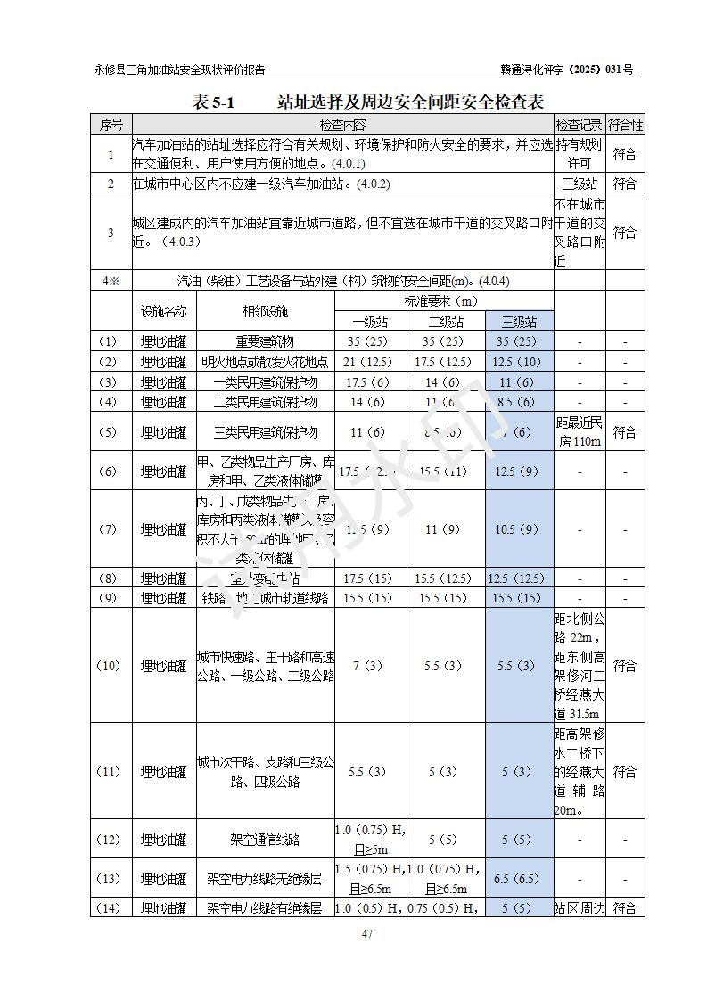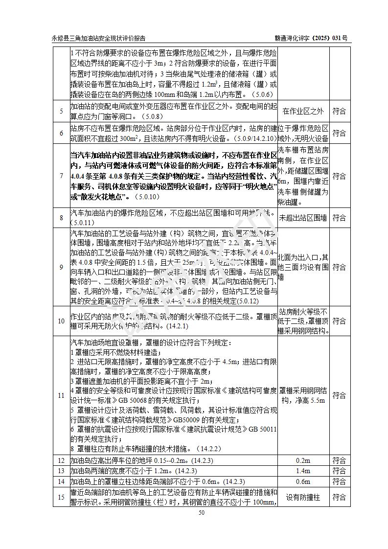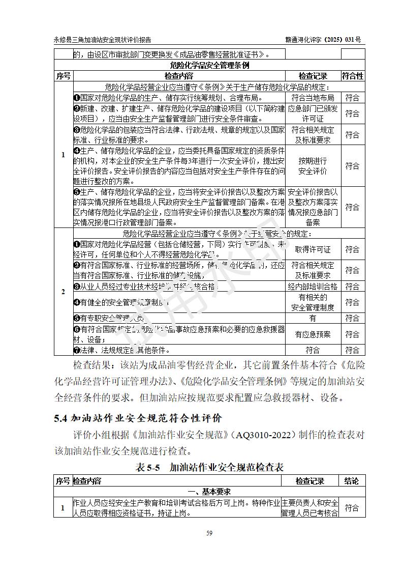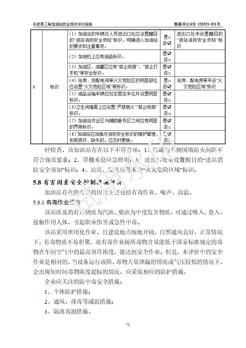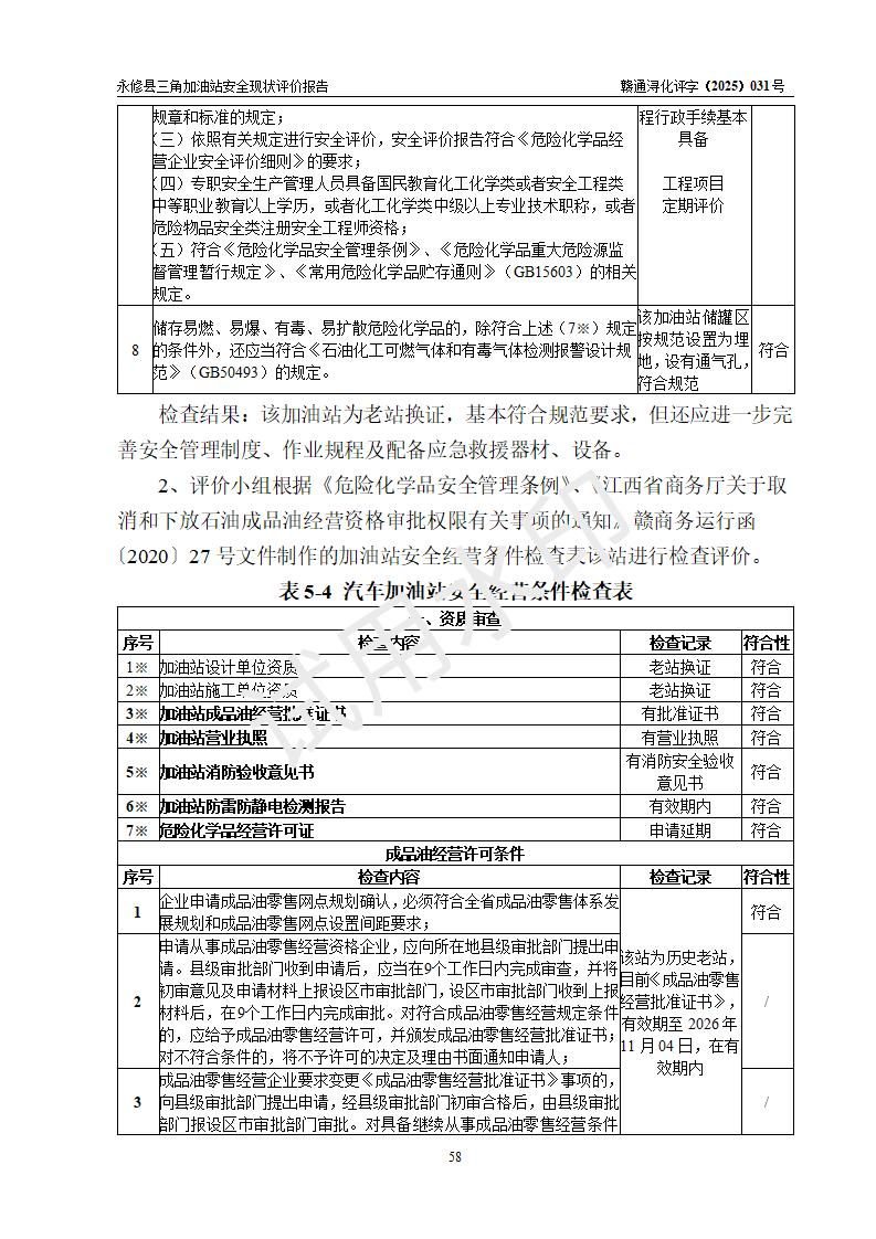 評(píng)價(jià)結(jié)論 | 永修縣三角加油站涉及的安全條件、安全經(jīng)營(yíng)條件、安全生產(chǎn)管理符合《危險(xiǎn)化學(xué)品經(jīng)營(yíng)許可證管理辦法》、《汽車加油加氣加氫站技術(shù)標(biāo)準(zhǔn)》等**有關(guān)法規(guī)、標(biāo)準(zhǔn)、規(guī)范要求,能滿足危險(xiǎn)化學(xué)品經(jīng)營(yíng)安全條件。 | ||||
