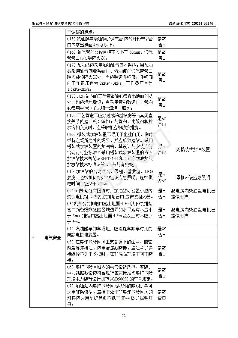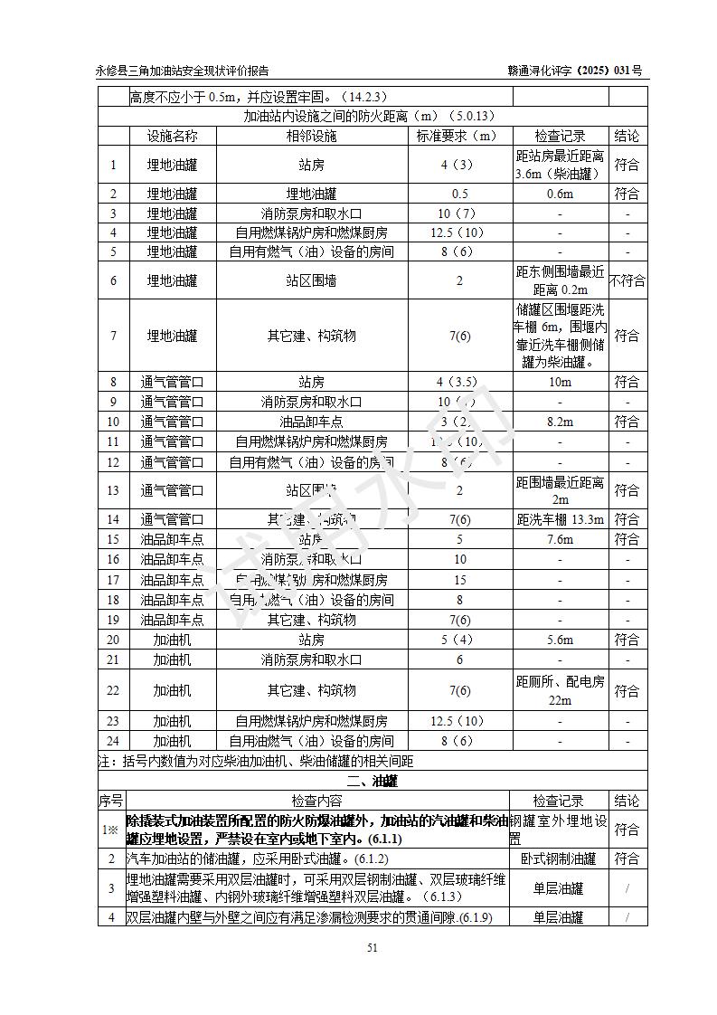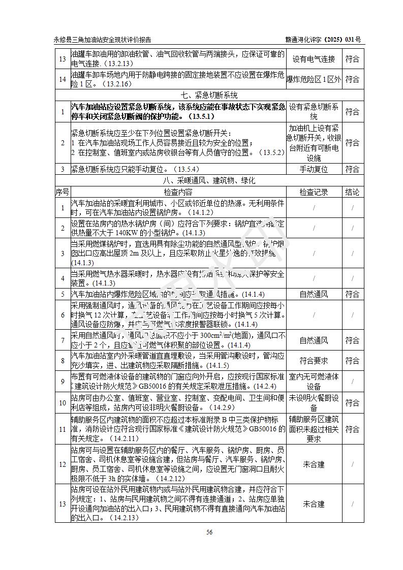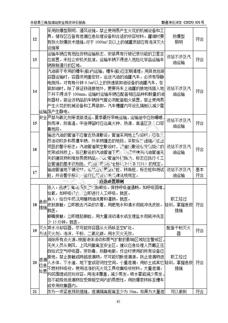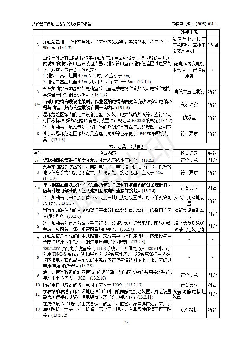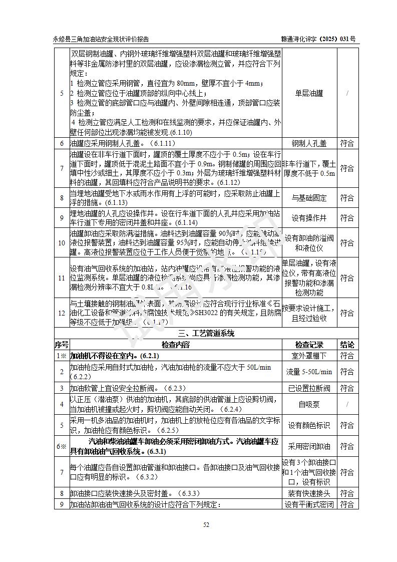 評(píng)價(jià)結(jié)論 | 永修縣三角加油站涉及的安全條件、安全經(jīng)營(yíng)條件、安全生產(chǎn)管理符合《危險(xiǎn)化學(xué)品經(jīng)營(yíng)許可證管理辦法》、《汽車加油加氣加氫站技術(shù)標(biāo)準(zhǔn)》等**有關(guān)法規(guī)、標(biāo)準(zhǔn)、規(guī)范要求,能滿足危險(xiǎn)化學(xué)品經(jīng)營(yíng)安全條件。 | ||||