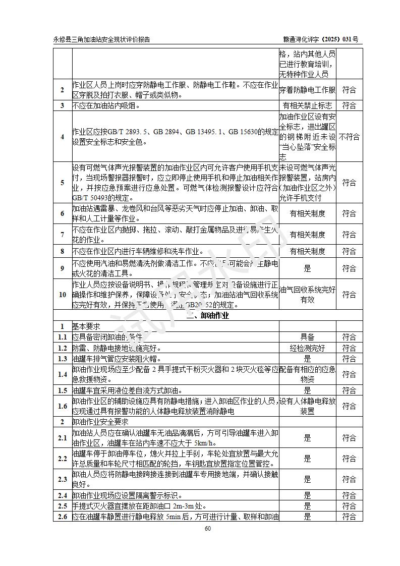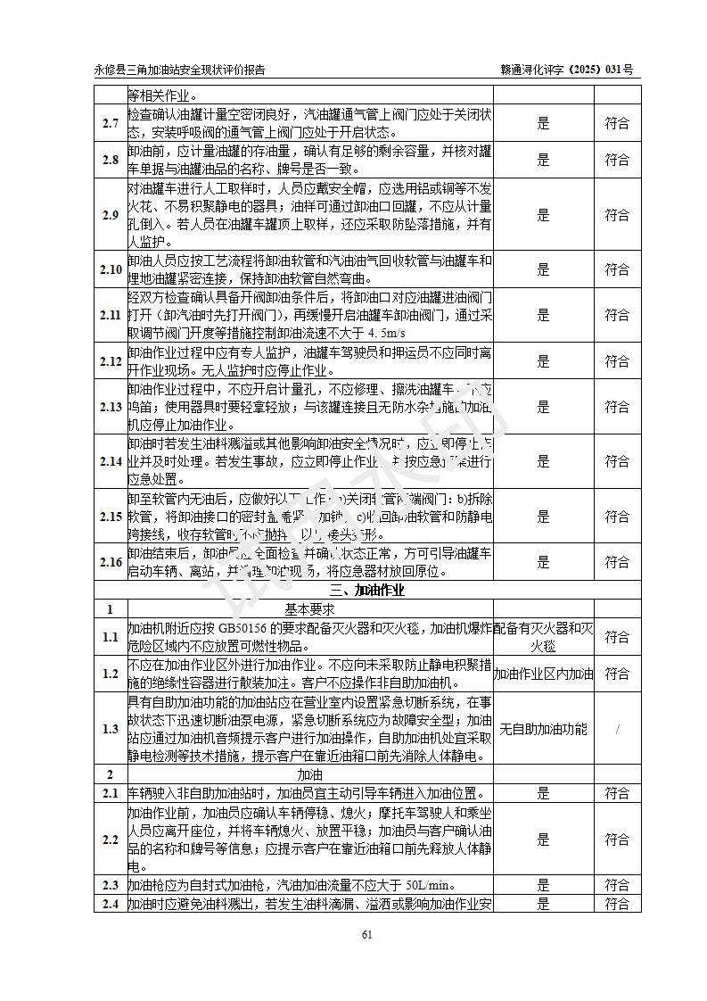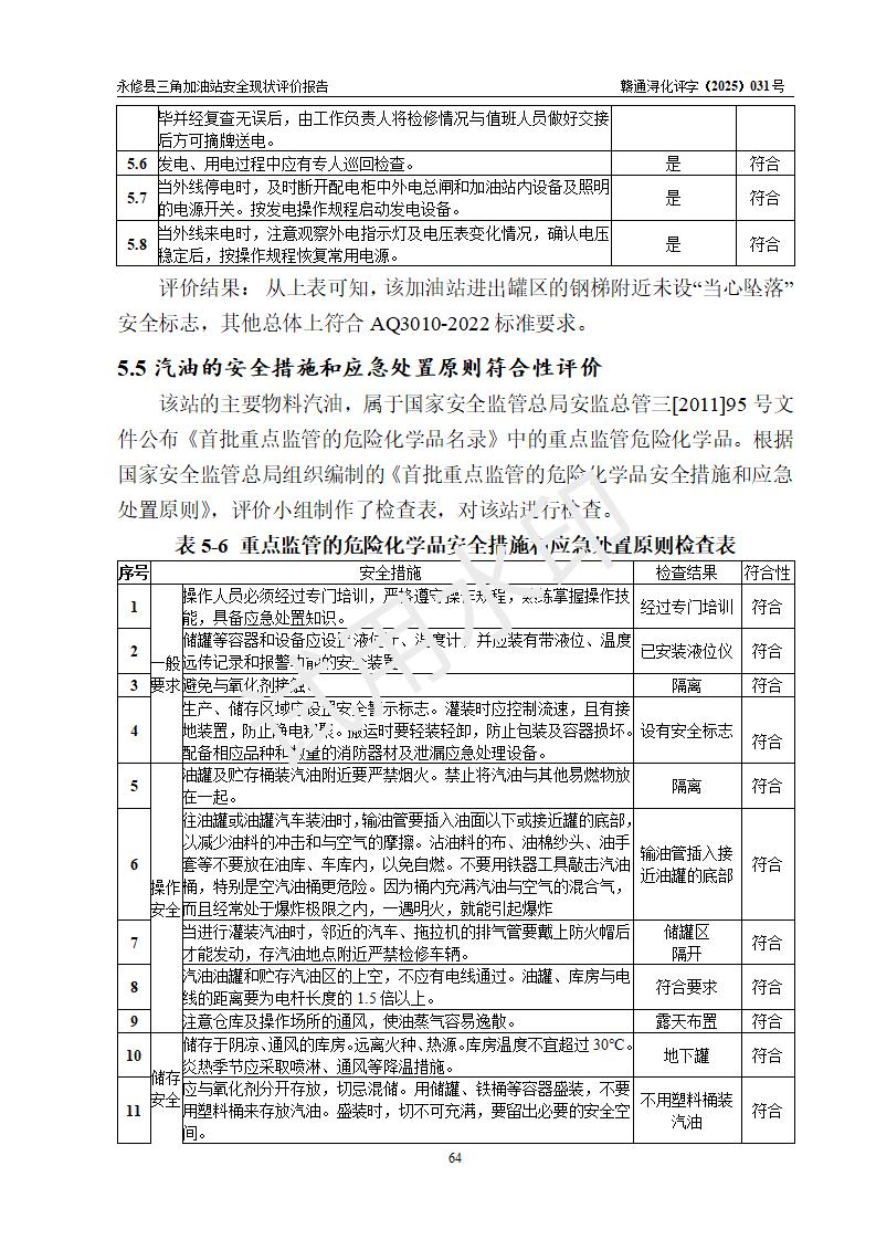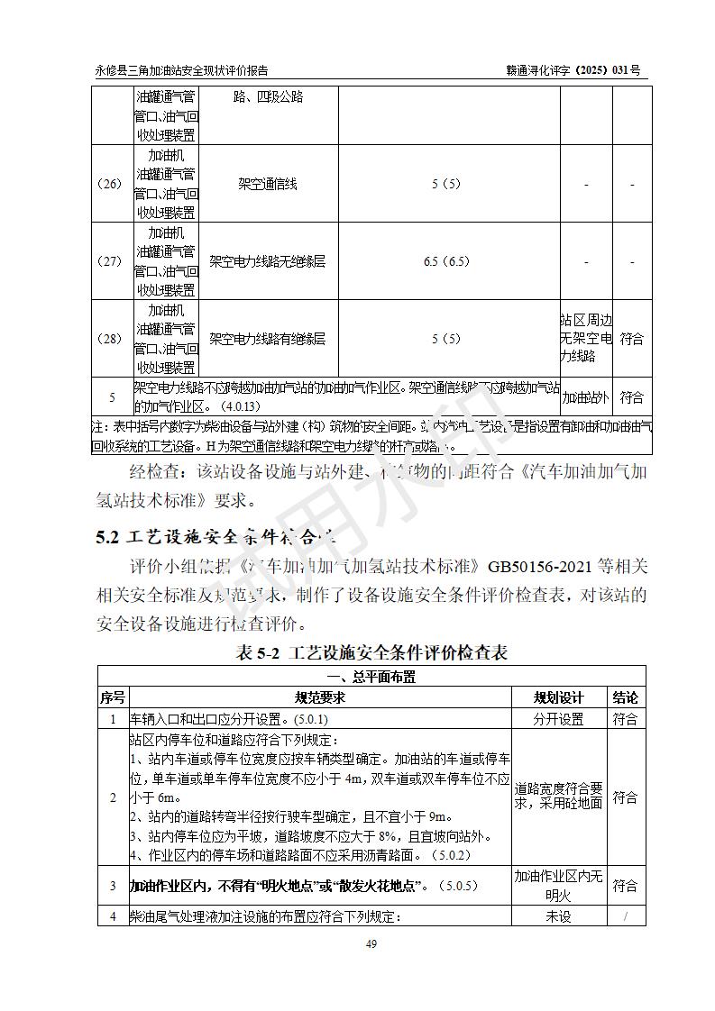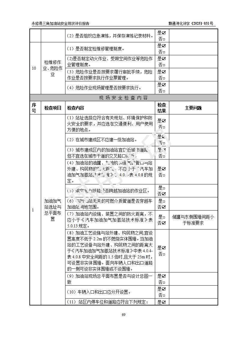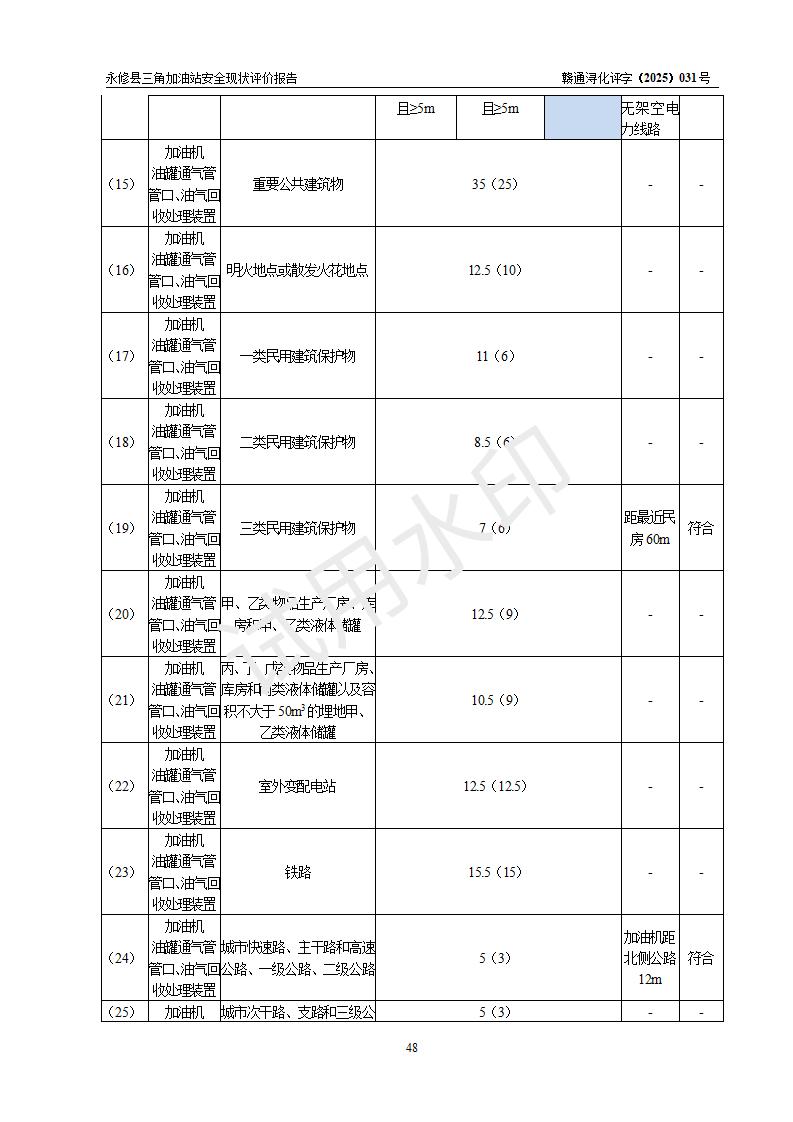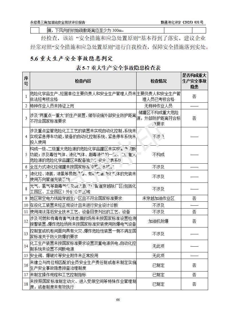 評(píng)價(jià)結(jié)論 | 永修縣三角加油站涉及的安全條件、安全經(jīng)營(yíng)條件、安全生產(chǎn)管理符合《危險(xiǎn)化學(xué)品經(jīng)營(yíng)許可證管理辦法》、《汽車加油加氣加氫站技術(shù)標(biāo)準(zhǔn)》等**有關(guān)法規(guī)、標(biāo)準(zhǔn)、規(guī)范要求,能滿足危險(xiǎn)化學(xué)品經(jīng)營(yíng)安全條件。 | ||||