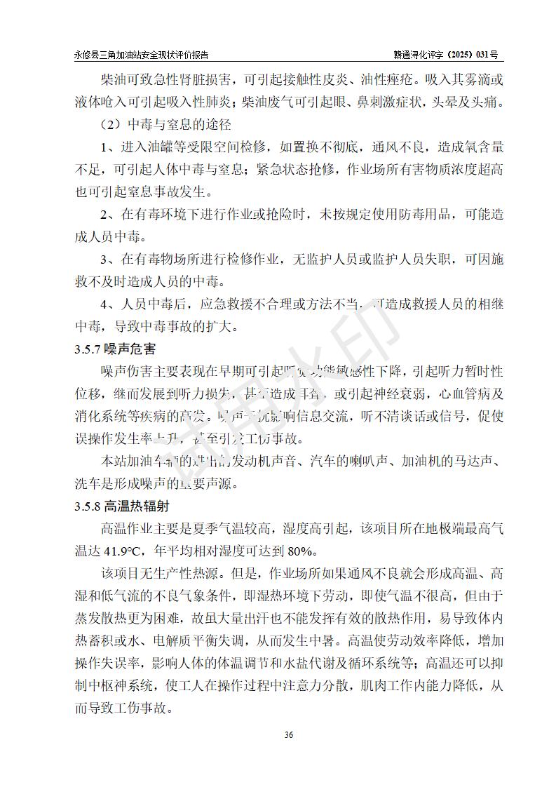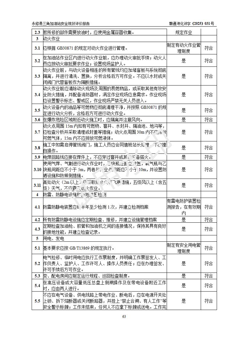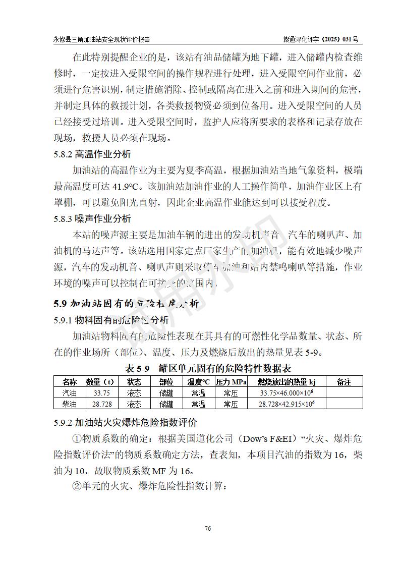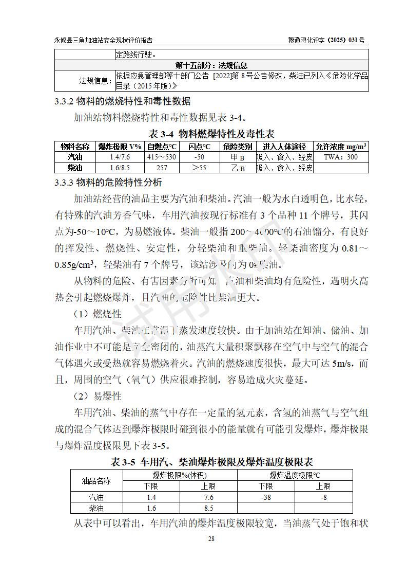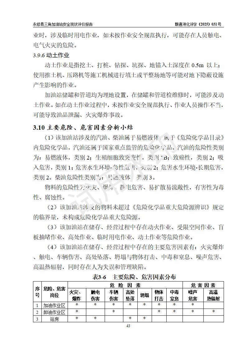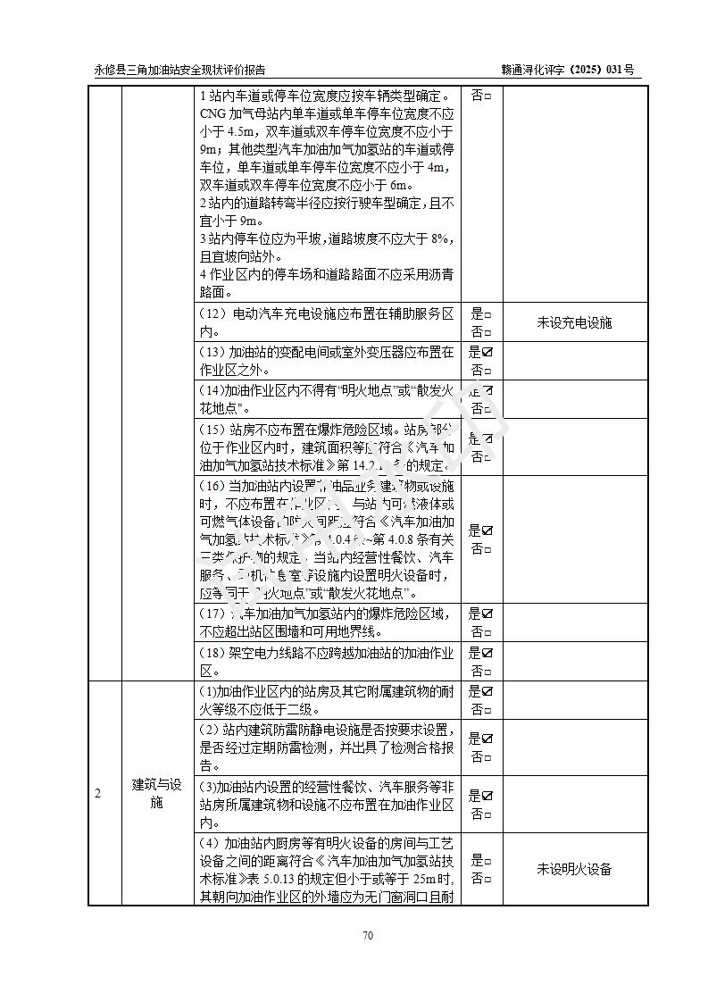 評(píng)價(jià)結(jié)論 | 永修縣三角加油站涉及的安全條件、安全經(jīng)營(yíng)條件、安全生產(chǎn)管理符合《危險(xiǎn)化學(xué)品經(jīng)營(yíng)許可證管理辦法》、《汽車加油加氣加氫站技術(shù)標(biāo)準(zhǔn)》等**有關(guān)法規(guī)、標(biāo)準(zhǔn)、規(guī)范要求,能滿足危險(xiǎn)化學(xué)品經(jīng)營(yíng)安全條件。 | ||||