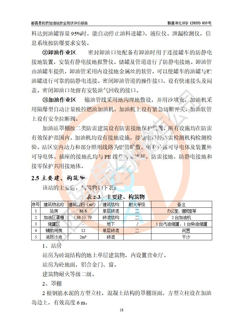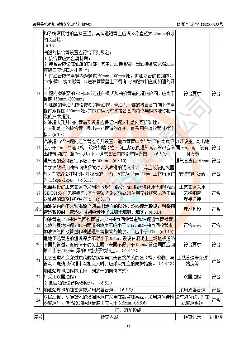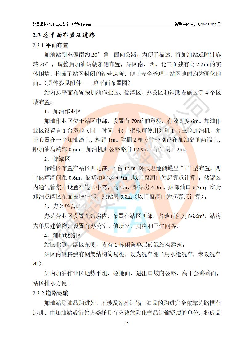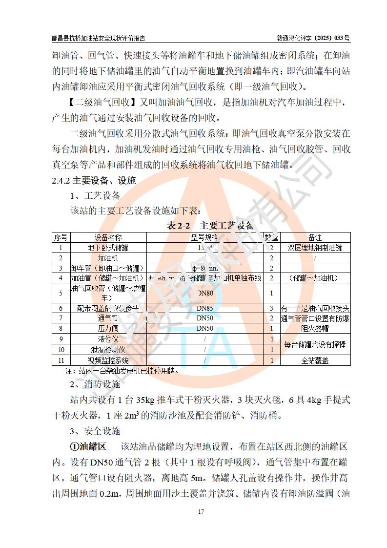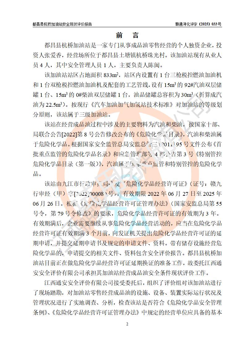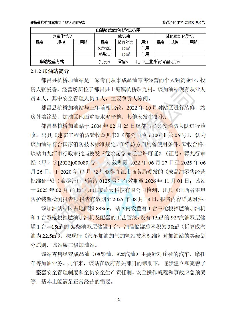 都昌縣杭橋加油站是一家專門從事成品油零售經營的個人獨資企業(yè),投資人張愛香,經營場所位于都昌縣土塘鎮(zhèn)杭橋珠光村。該加油站現有從業(yè)人員4人,其中安全管理人員1人,主要負責人陳閩。 該加油站站區(qū)占地面積833m2,站區(qū)內設置有1臺三槍稅控燃油加油機和1臺雙槍稅控燃油加油機及配套的工藝管線,設有15m3的92#汽油雙層儲罐1臺、15m3的0#柴油雙層儲罐1臺,油品儲罐總容積為30m3(折算成汽油為22.5m3)。按現行《汽車加油加氣加氫站技術標準》對加油站的等級劃分原則,該站屬于三級加油站。 該站由九江市行政審批局換發(fā)《危險化學品經營許可證》(證號:贛九行審經(甲)字[2022]000080號),**期限2022年06月27日至2025年06月26日。 |