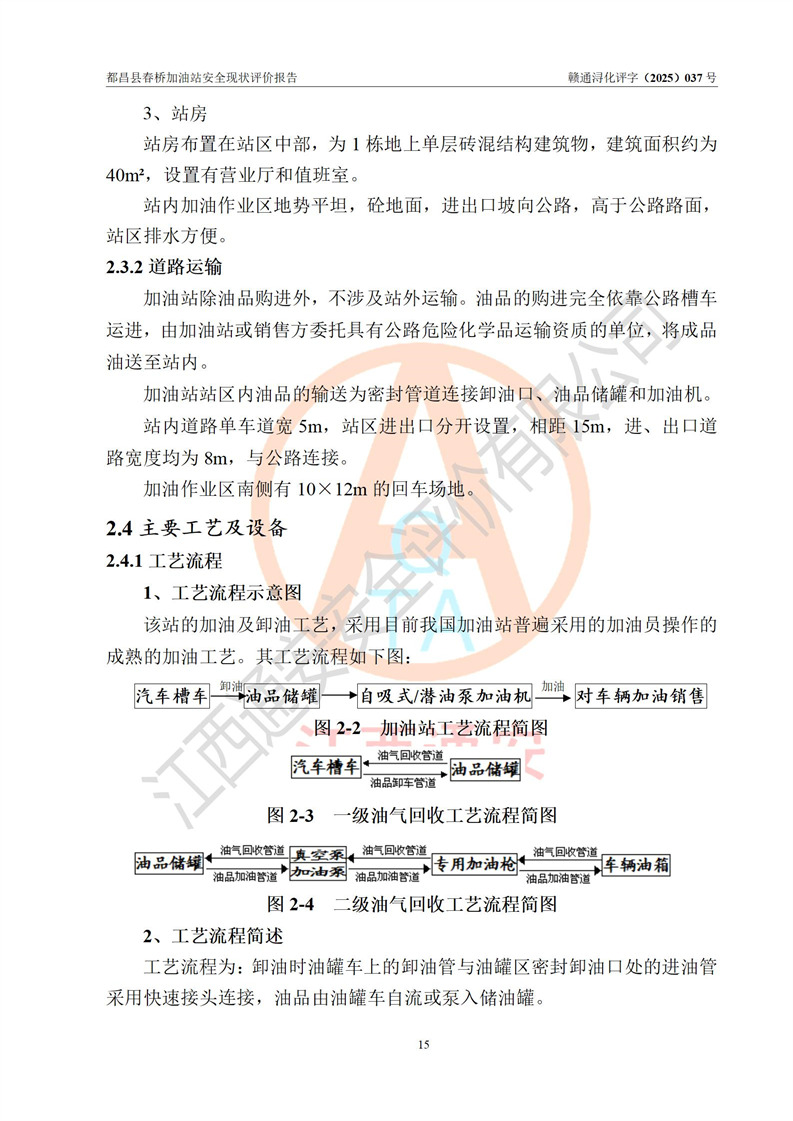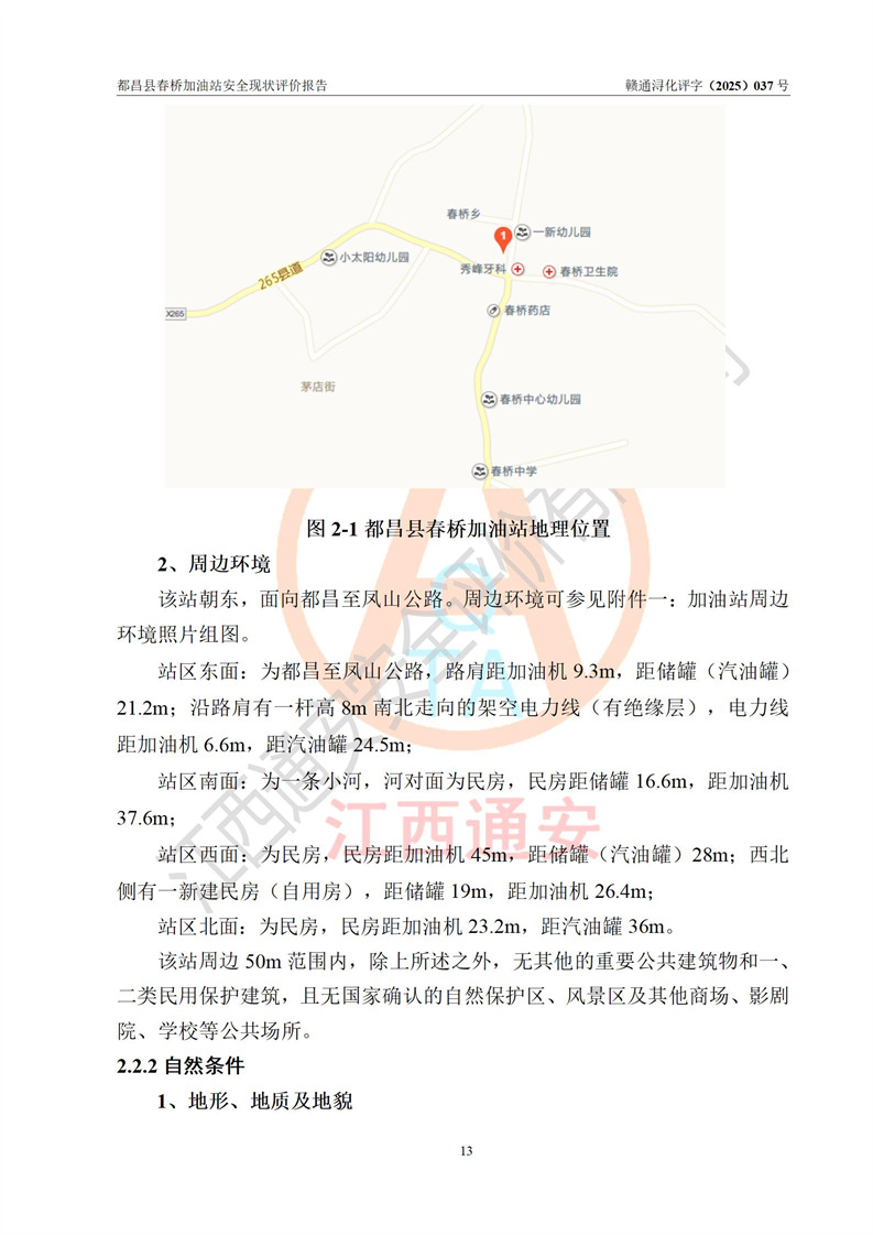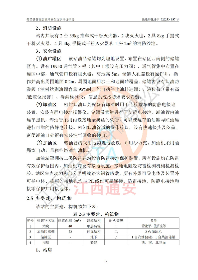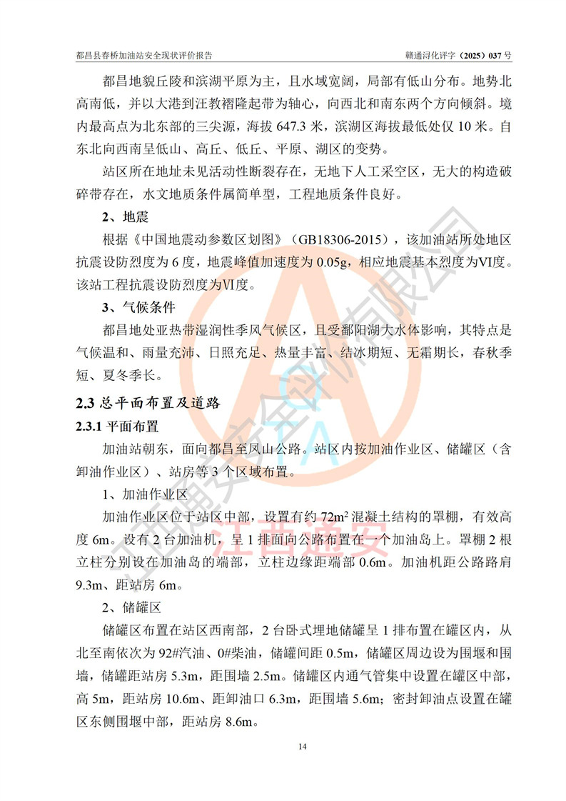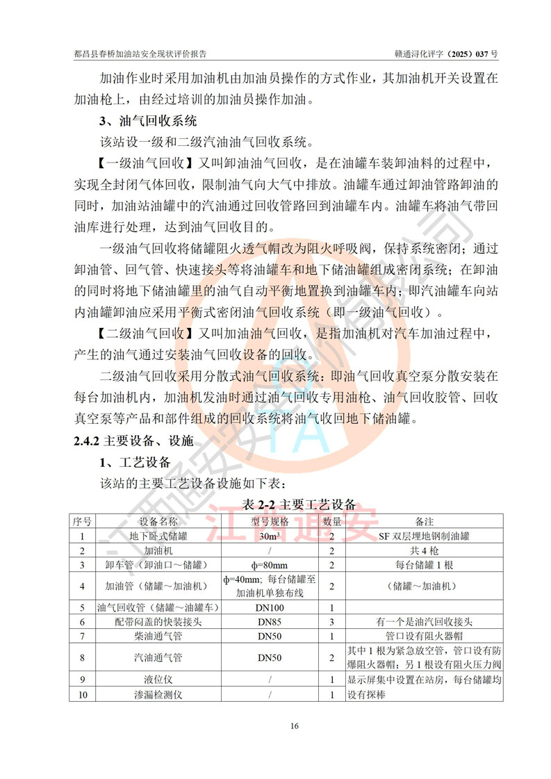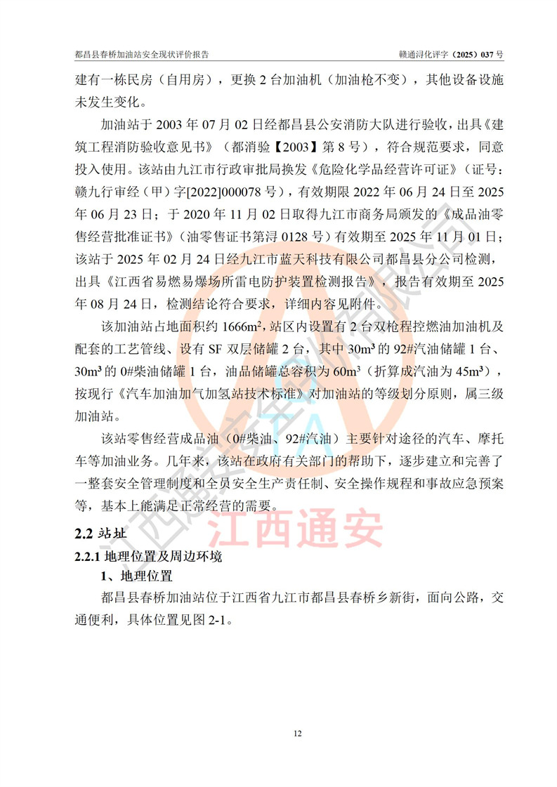 項(xiàng)目簡(jiǎn)介 | 都昌縣春橋加油站是一家專(zhuān)門(mén)從事成品油零售經(jīng)營(yíng)的個(gè)人獨(dú)資企業(yè),經(jīng)營(yíng)場(chǎng)所位于江西省九江市都昌縣春橋鄉(xiāng)新街。現(xiàn)有從業(yè)人員3名,其中安全管理人員1人,加油站負(fù)責(zé)人楊金。 該加油站占地面積約1666m2,站區(qū)內(nèi)設(shè)置有2臺(tái)雙槍程控燃油加油機(jī)及配套的工藝管線(xiàn)、設(shè)有SF雙層儲(chǔ)罐2臺(tái),其中30m3的92#汽油儲(chǔ)罐1臺(tái)、30m3的0#柴油儲(chǔ)罐1臺(tái),油品儲(chǔ)罐總?cè)莘e為60m3(折算成汽油為45m3),按現(xiàn)行《汽車(chē)加油加氣加氫站技術(shù)標(biāo)準(zhǔn)》對(duì)加油站的等級(jí)劃分原則,屬三級(jí)加油站。 該站由九江市行政審批局換發(fā)《危險(xiǎn)化學(xué)品經(jīng)營(yíng)許可證》(證號(hào):贛九行審經(jīng)(甲)字[2022]000078號(hào)),**期限2022年06月24日至2025年06月23日。 | |||