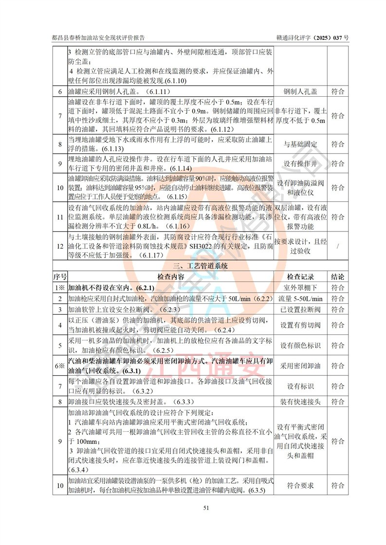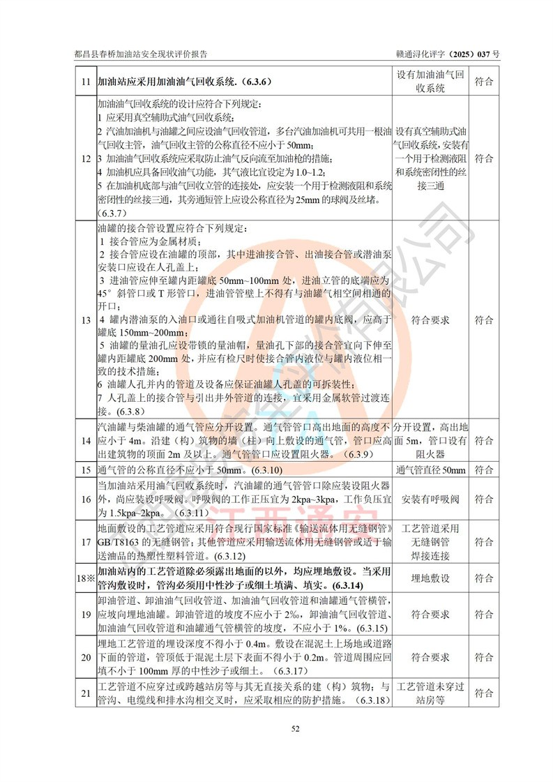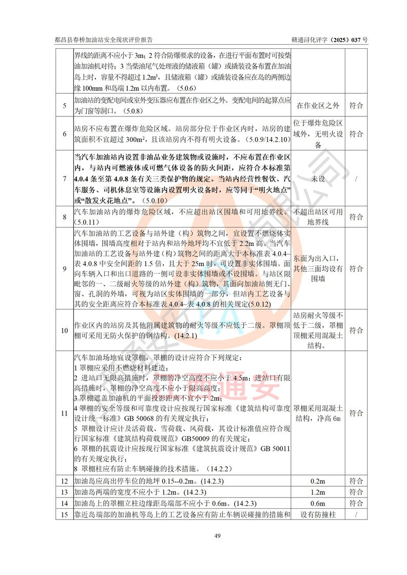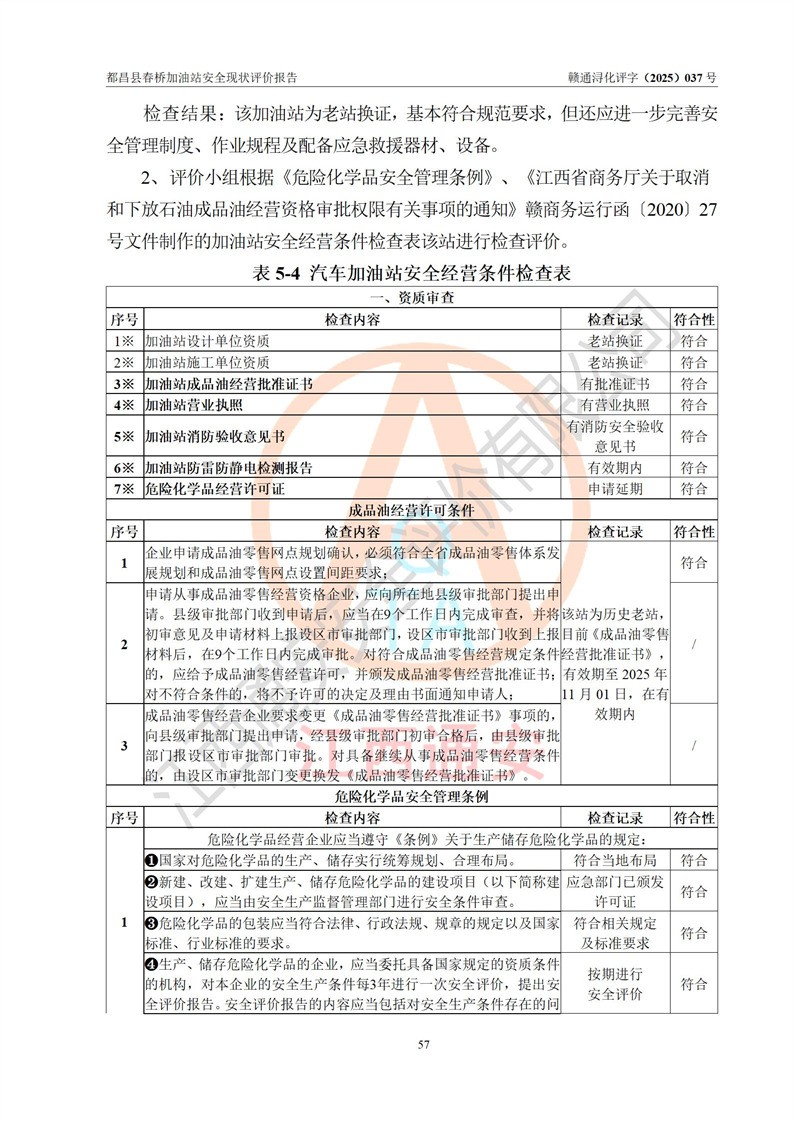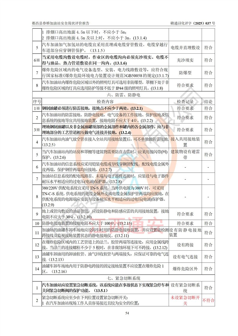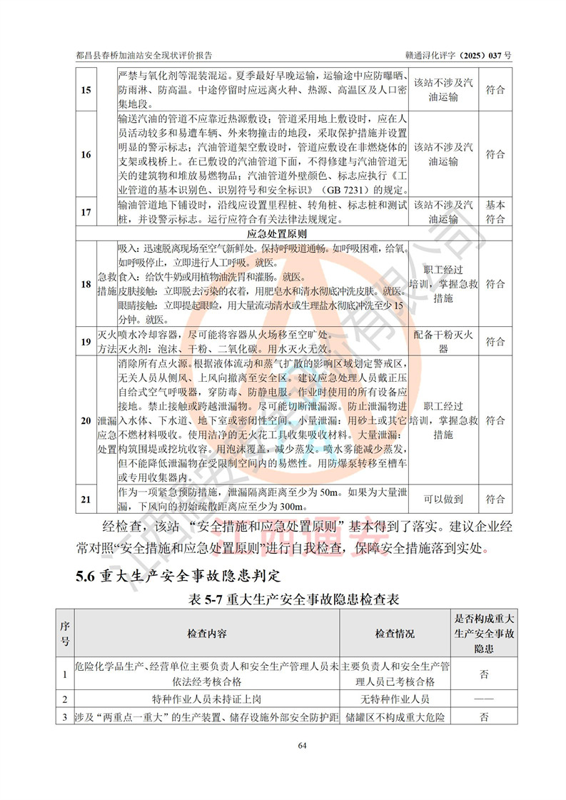 評(píng)價(jià)結(jié)論 | 都昌縣春橋加油站涉及的安全條件、安全經(jīng)營(yíng)條件、安全生產(chǎn)管理符合《危險(xiǎn)化學(xué)品經(jīng)營(yíng)許可證管理辦法》、《汽車(chē)加油加氣加氫站技術(shù)標(biāo)準(zhǔn)》等**有關(guān)法規(guī)、標(biāo)準(zhǔn)、規(guī)范要求,能滿(mǎn)足危險(xiǎn)化學(xué)品經(jīng)營(yíng)安全條件。 | |||