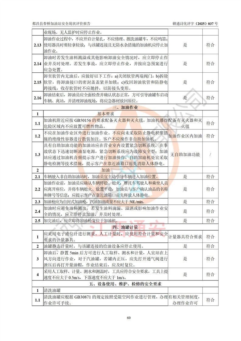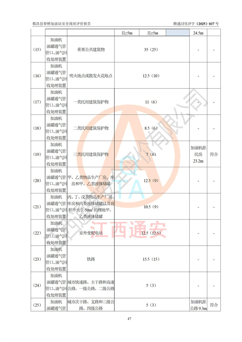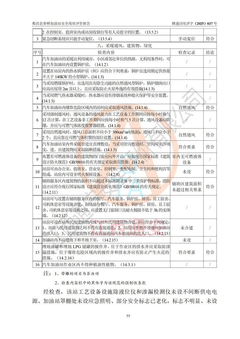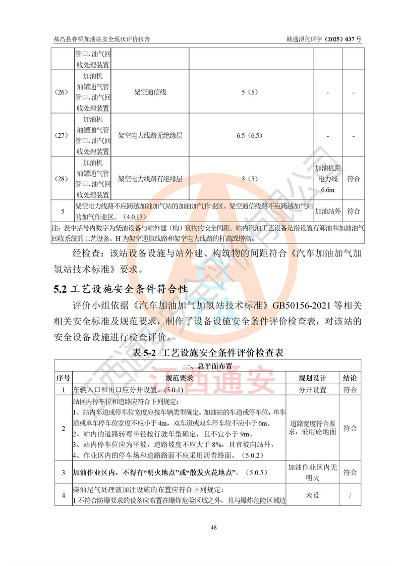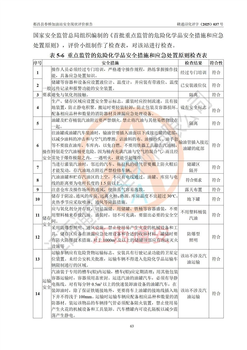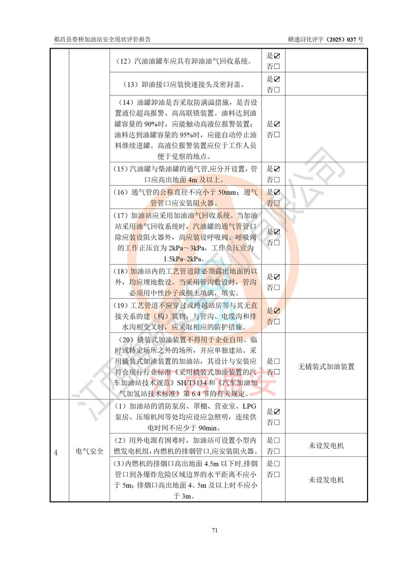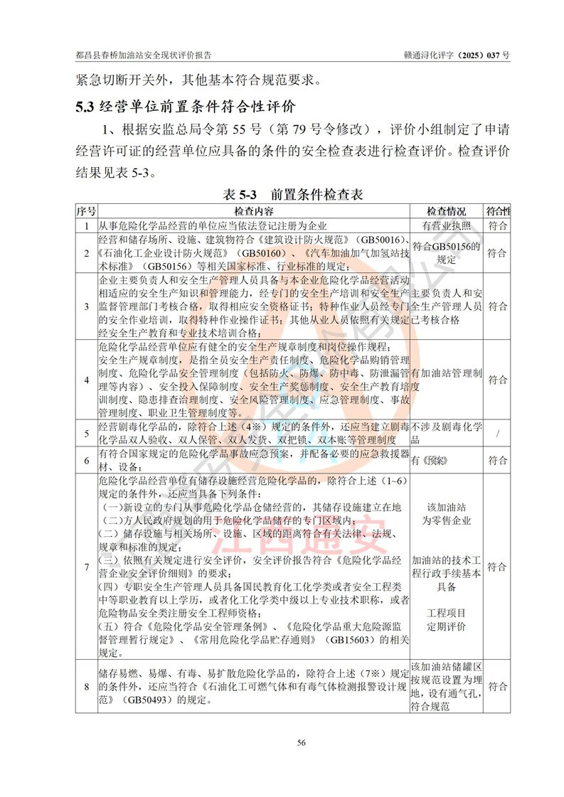評(píng)價(jià)結(jié)論 | 都昌縣春橋加油站涉及的安全條件、安全經(jīng)營(yíng)條件、安全生產(chǎn)管理符合《危險(xiǎn)化學(xué)品經(jīng)營(yíng)許可證管理辦法》、《汽車(chē)加油加氣加氫站技術(shù)標(biāo)準(zhǔn)》等**有關(guān)法規(guī)、標(biāo)準(zhǔn)、規(guī)范要求,能滿(mǎn)足危險(xiǎn)化學(xué)品經(jīng)營(yíng)安全條件。 | |||