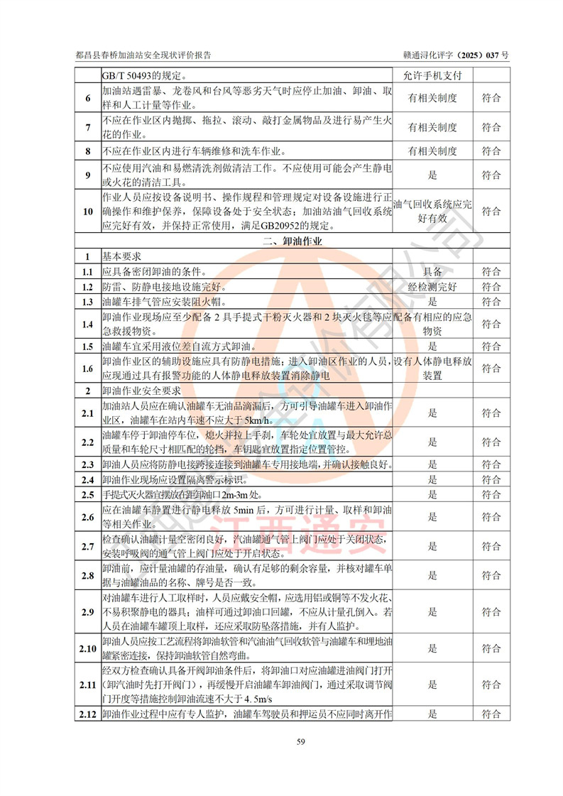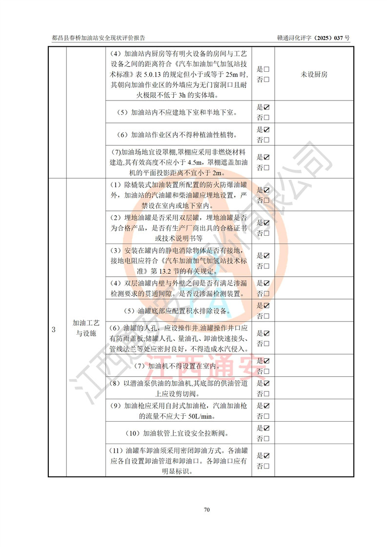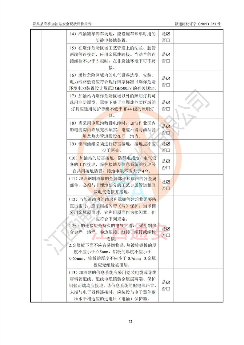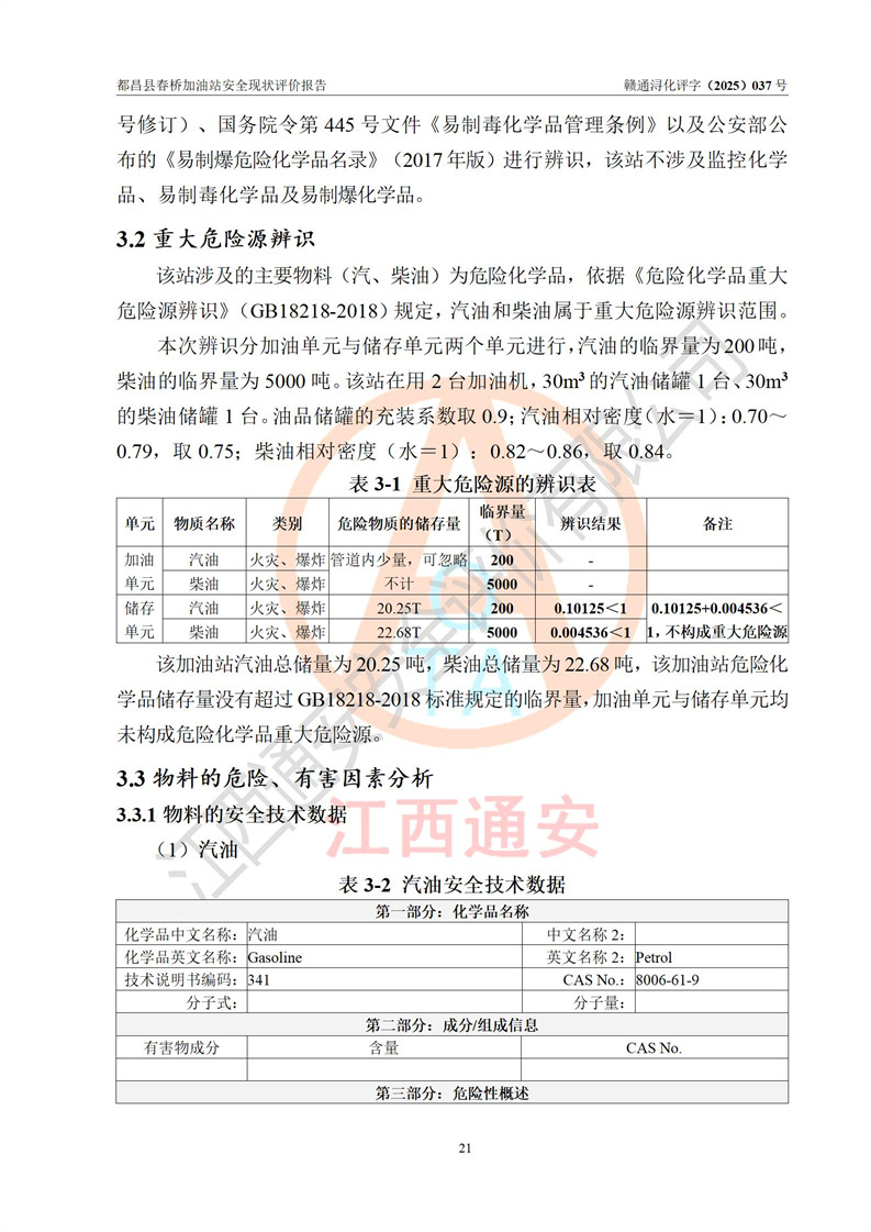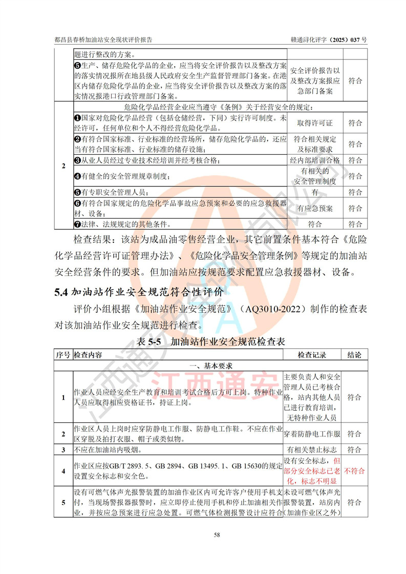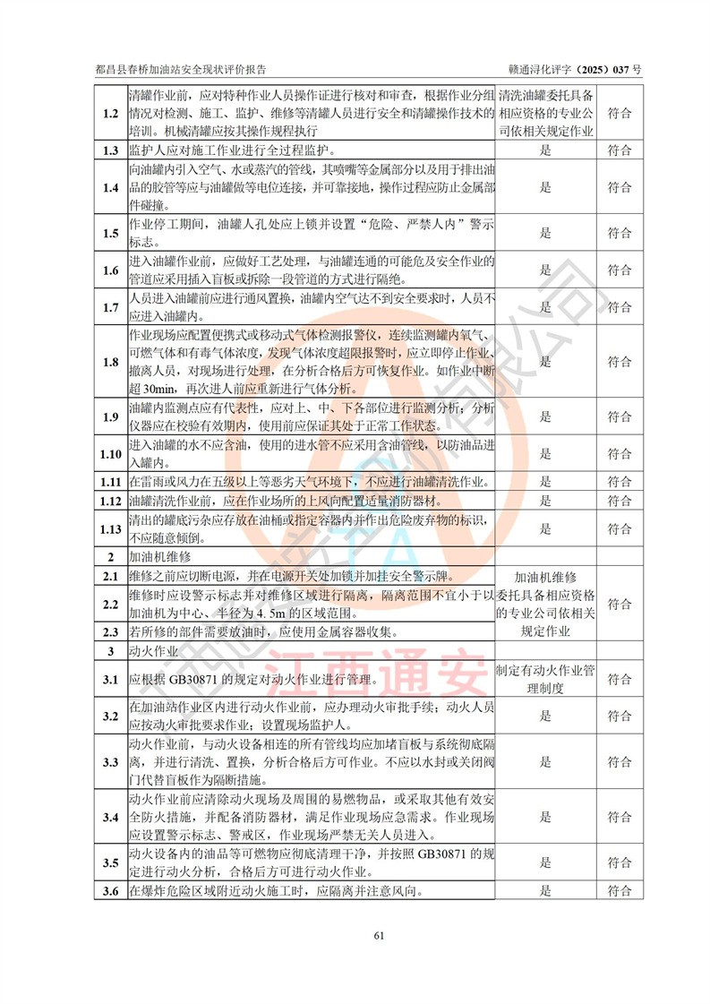 評(píng)價(jià)結(jié)論 | 都昌縣春橋加油站涉及的安全條件、安全經(jīng)營(yíng)條件、安全生產(chǎn)管理符合《危險(xiǎn)化學(xué)品經(jīng)營(yíng)許可證管理辦法》、《汽車(chē)加油加氣加氫站技術(shù)標(biāo)準(zhǔn)》等**有關(guān)法規(guī)、標(biāo)準(zhǔn)、規(guī)范要求,能滿(mǎn)足危險(xiǎn)化學(xué)品經(jīng)營(yíng)安全條件。 | |||