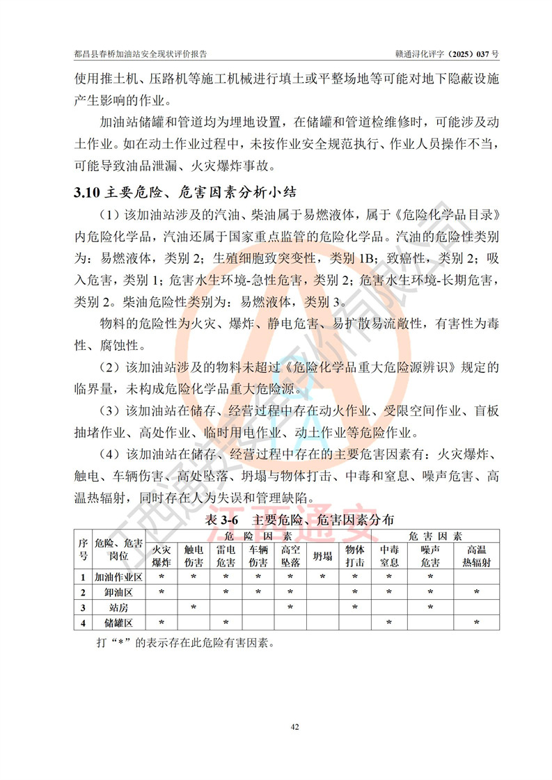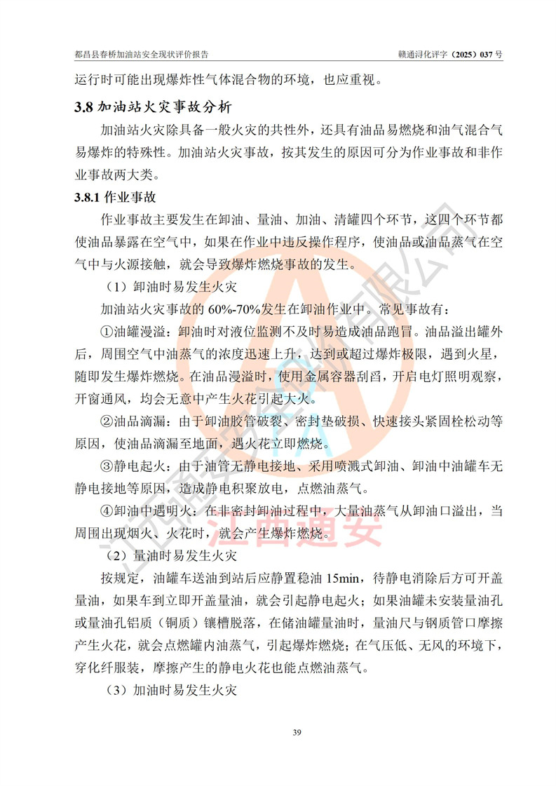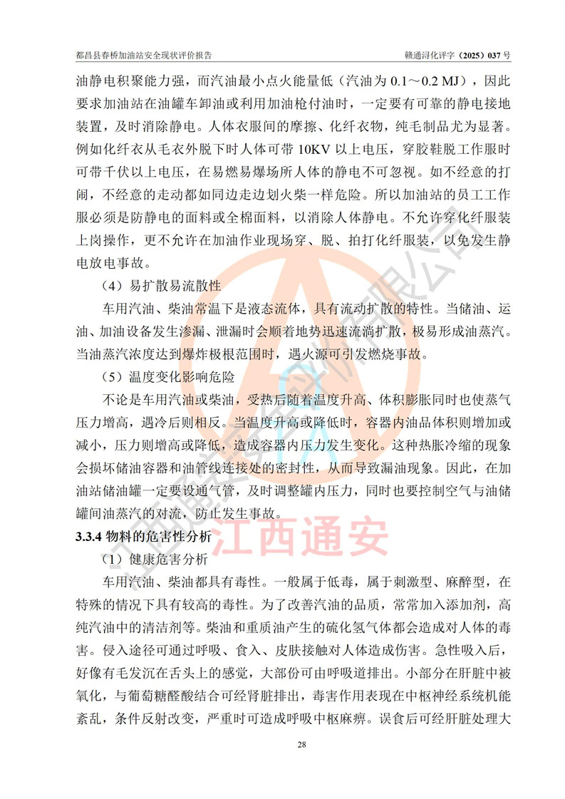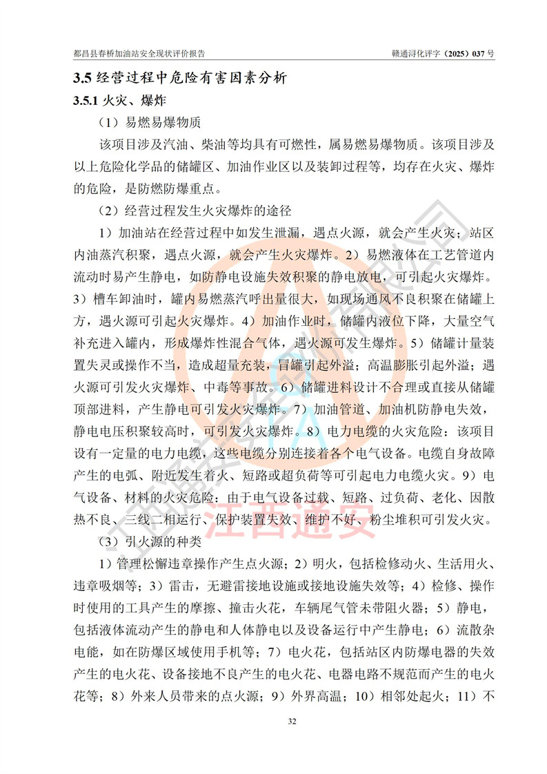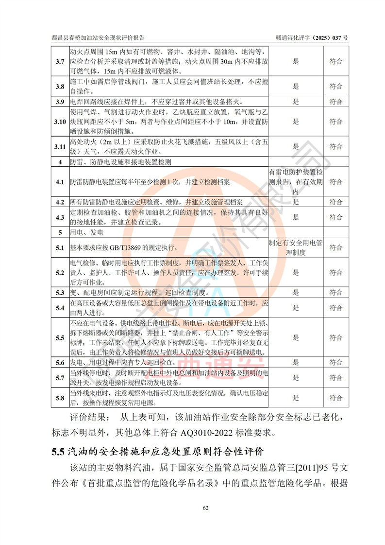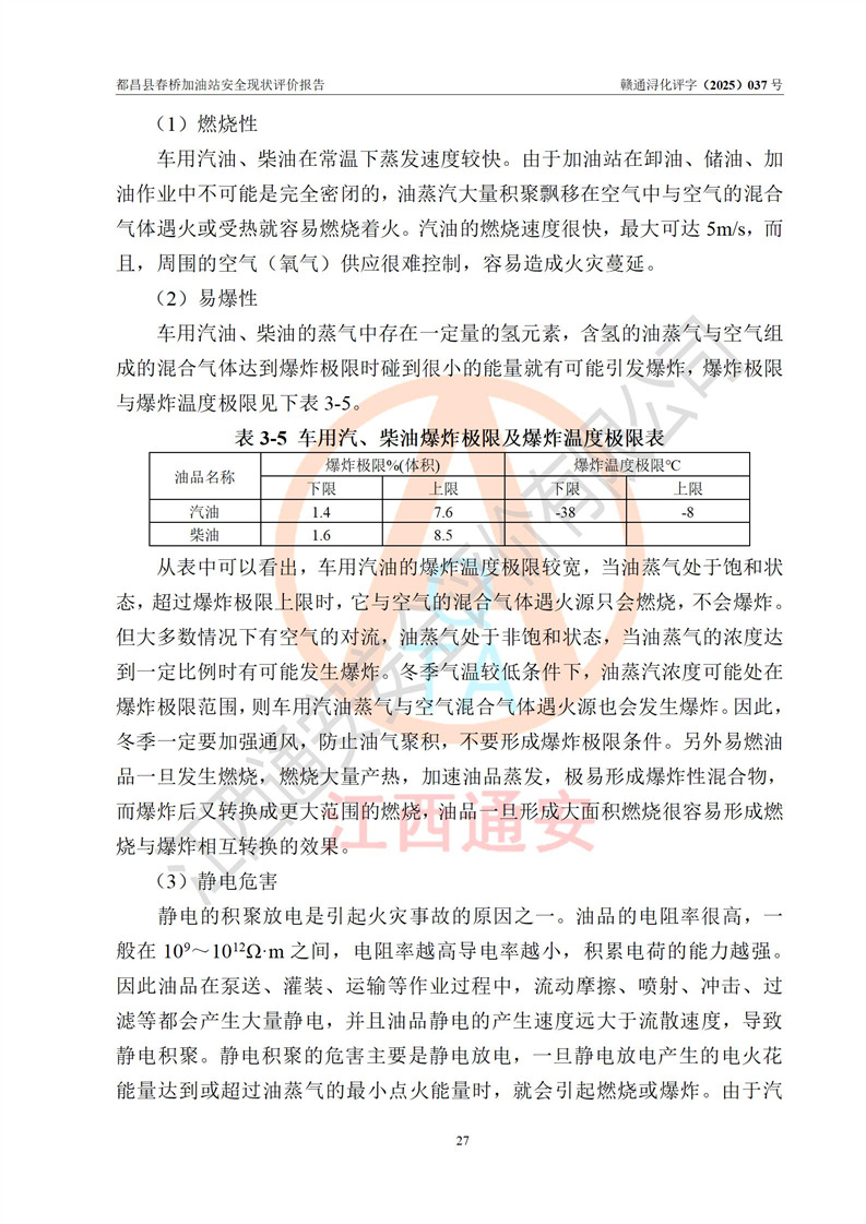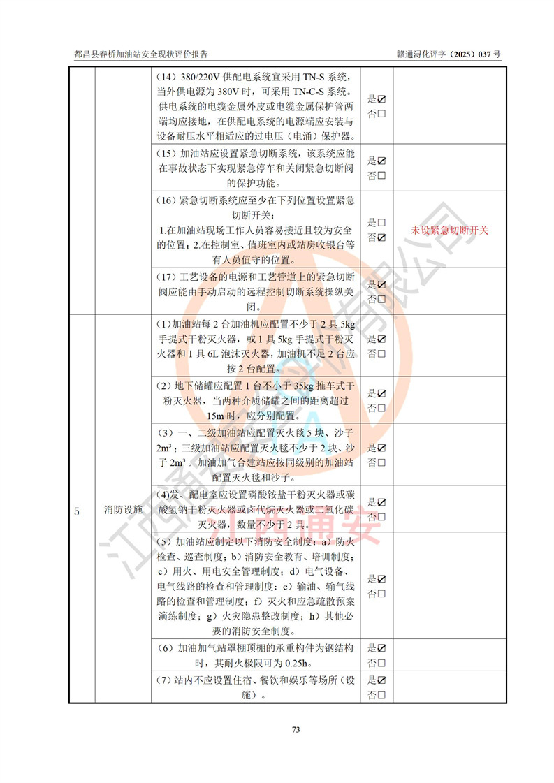 評(píng)價(jià)結(jié)論 | 都昌縣春橋加油站涉及的安全條件、安全經(jīng)營(yíng)條件、安全生產(chǎn)管理符合《危險(xiǎn)化學(xué)品經(jīng)營(yíng)許可證管理辦法》、《汽車(chē)加油加氣加氫站技術(shù)標(biāo)準(zhǔn)》等**有關(guān)法規(guī)、標(biāo)準(zhǔn)、規(guī)范要求,能滿(mǎn)足危險(xiǎn)化學(xué)品經(jīng)營(yíng)安全條件。 | |||