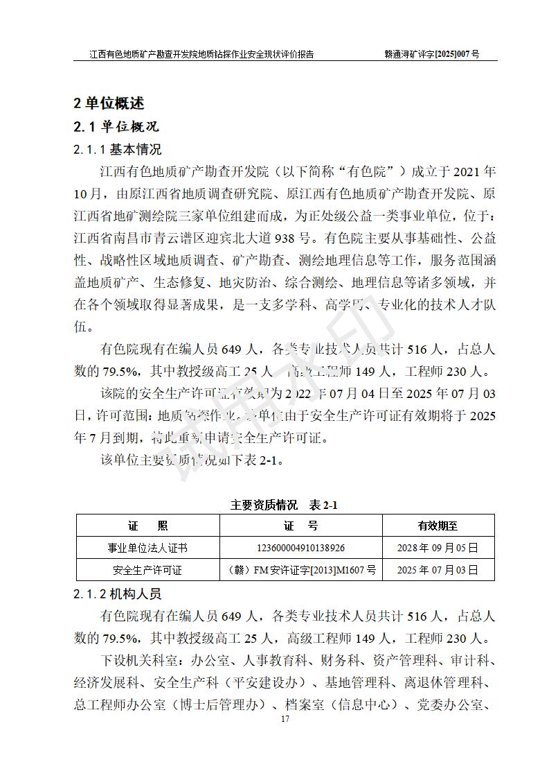 項目簡介 | 江西有色地質(zhì)礦產(chǎn)勘查開發(fā)院(以下簡稱“有色院”)成立于2021年10月,由原江西省地質(zhì)調(diào)查研究院、原江西有色地質(zhì)礦產(chǎn)勘查開發(fā)院、原江西省地礦測繪院三家單位組建而成,為正處級公益一類事業(yè)單位,位于:江西省南昌市青云譜區(qū)迎賓北大道938號。有色院主要從事基礎(chǔ)性、公益性、戰(zhàn)略性區(qū)域地質(zhì)調(diào)查、礦產(chǎn)勘查、測繪地理信息等工作,服務(wù)范圍涵蓋地質(zhì)礦產(chǎn)、生態(tài)修復(fù)、地災(zāi)防治、綜合測繪、地理信息等諸多領(lǐng)域,并在各個領(lǐng)域取得顯著成果,是一支多學(xué)科、高學(xué)歷、專業(yè)化的技術(shù)人才隊伍。 有色院現(xiàn)有在編人員649人,各類專業(yè)技術(shù)人員共計516人,占總?cè)藬?shù)的79.5%,其中**級高工25人,高級工程師149人,工程師230人。 該院上一輪安全生產(chǎn)許可證**期為2022年07月04日至2025年07月03日,許可范圍:地質(zhì)鉆探作業(yè)。該單位由于安全生產(chǎn)許可證**期將于2025年7月到期,特此重新申請安全生產(chǎn)許可證。按照《安全生產(chǎn)法》、《礦山安全法》和《關(guān)于做好非煤礦山企業(yè)安全生產(chǎn)許可證延期換證工作的通知》等有關(guān)規(guī)定,該單位在申請安全生產(chǎn)許可證前應(yīng)進行安全現(xiàn)狀評價。 | |||||