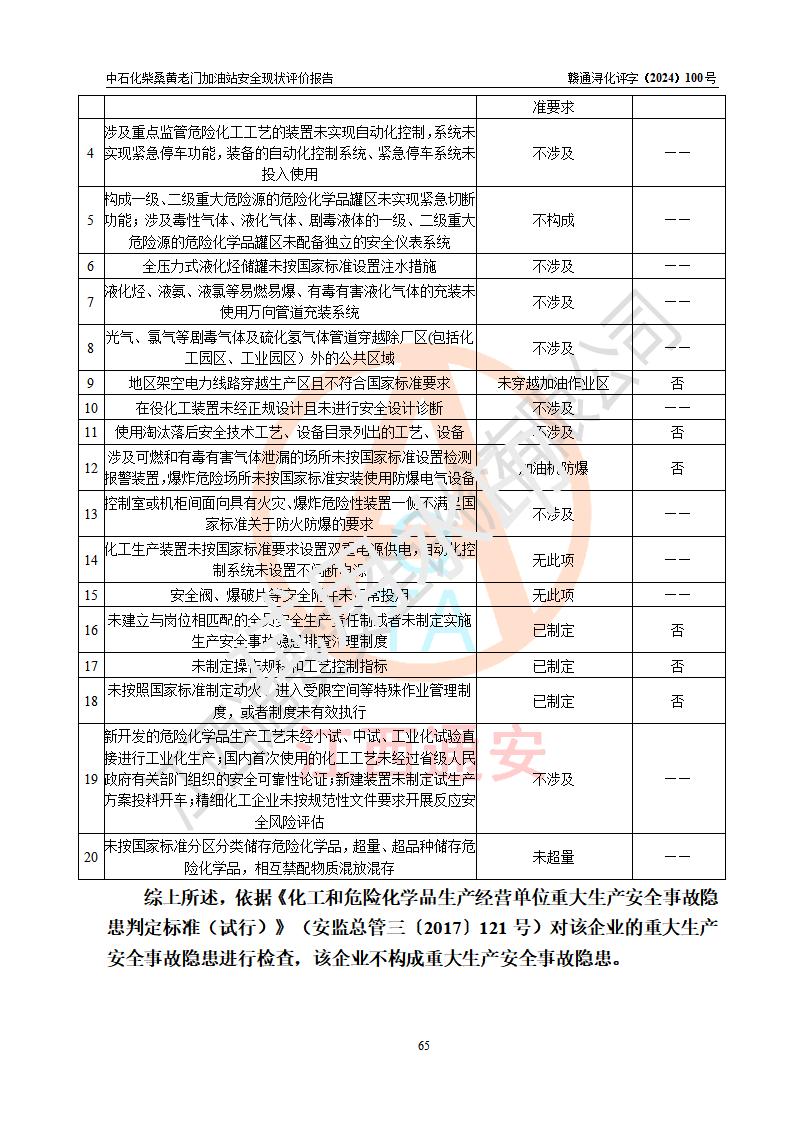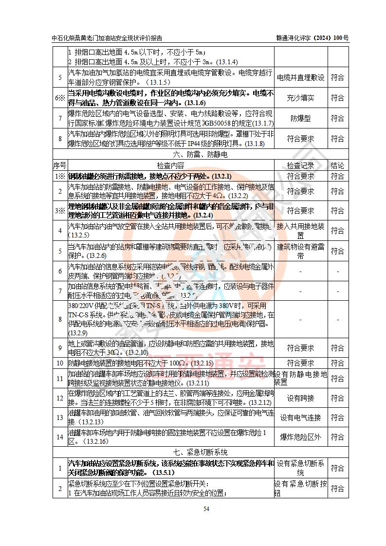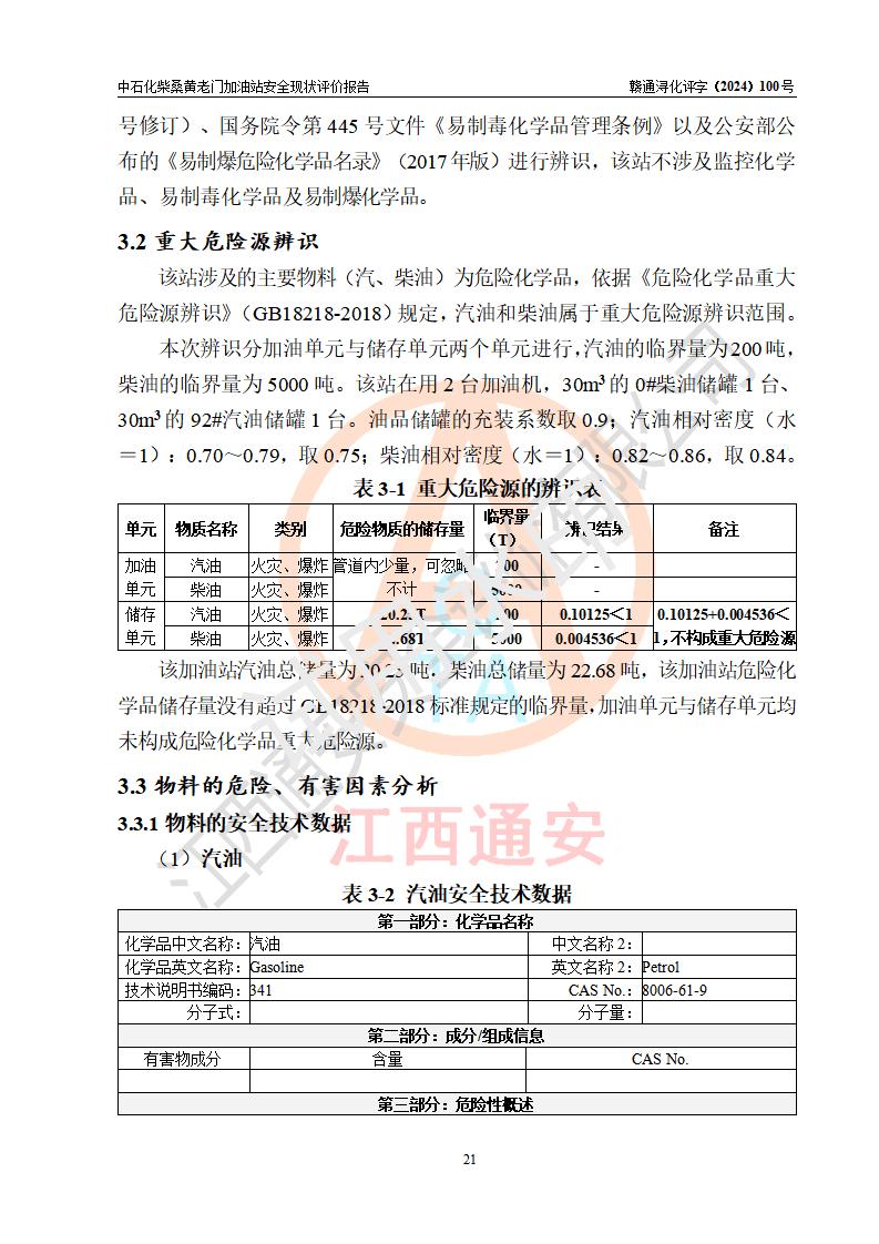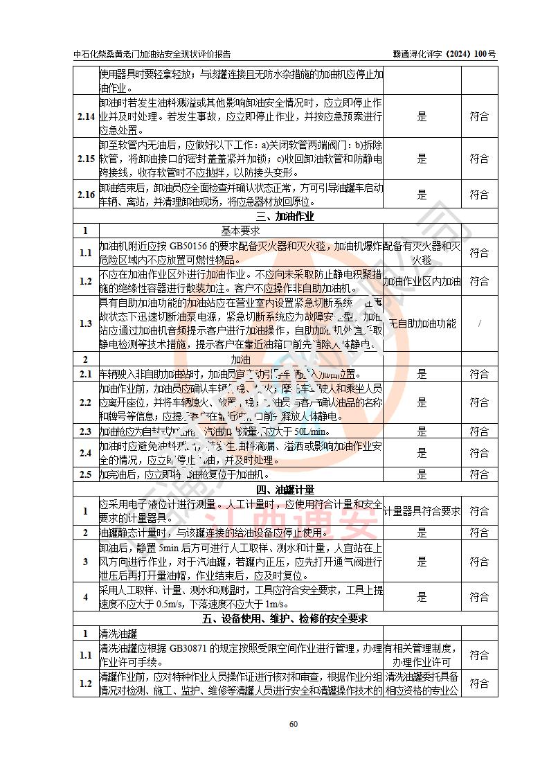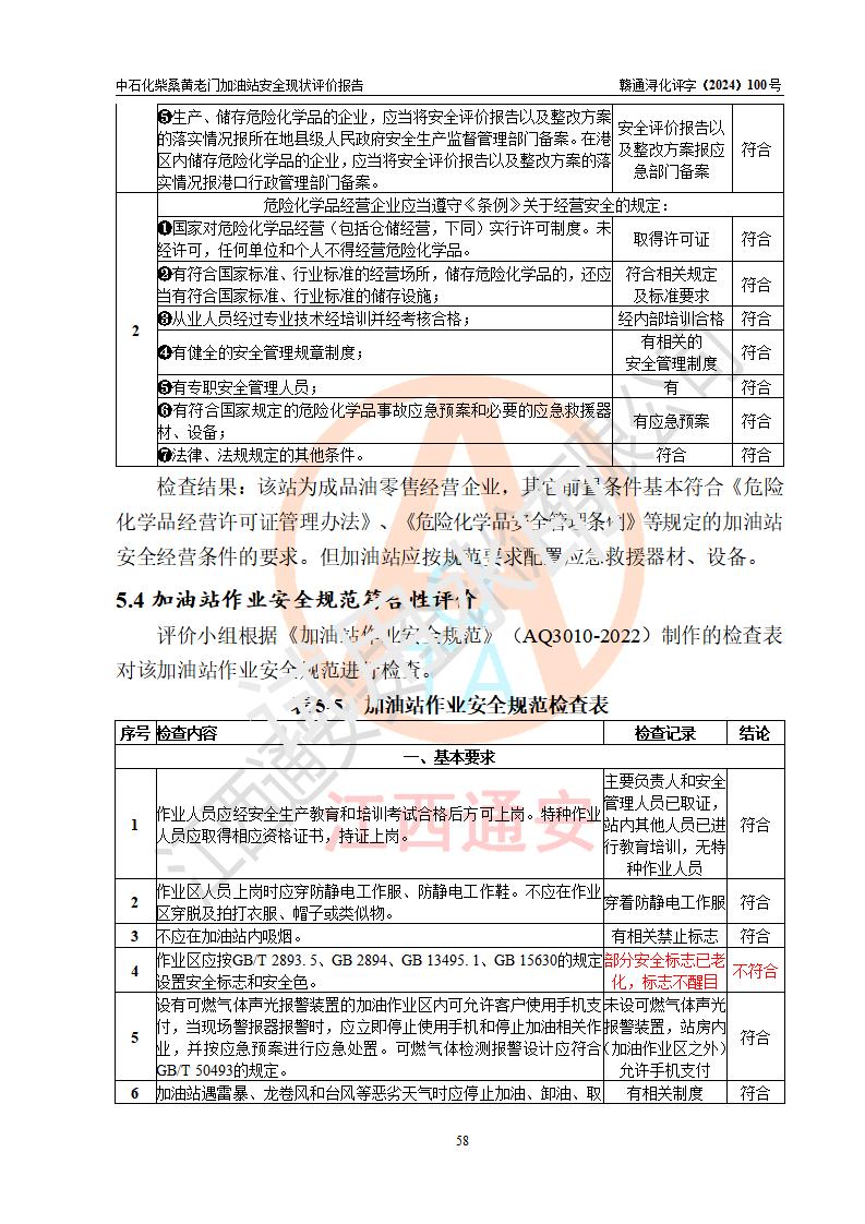 評價結論 | 中國石化銷售股份有限公司江西九江柴桑石油分公司黃老門加油站涉及的安全條件、安全經營條件、安全生產管理符合《危險化學品經營許可證管理辦法》、《汽車加油加氣加氫站技術標準》等**有關法規(guī)、標準、規(guī)范要求,能滿足危險化學品經營安全條件。 | |||