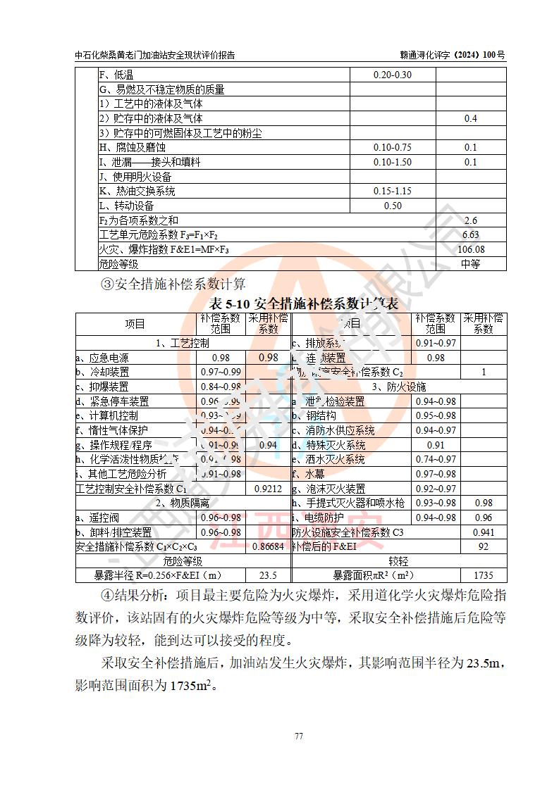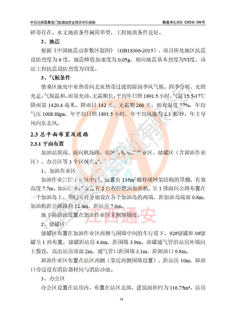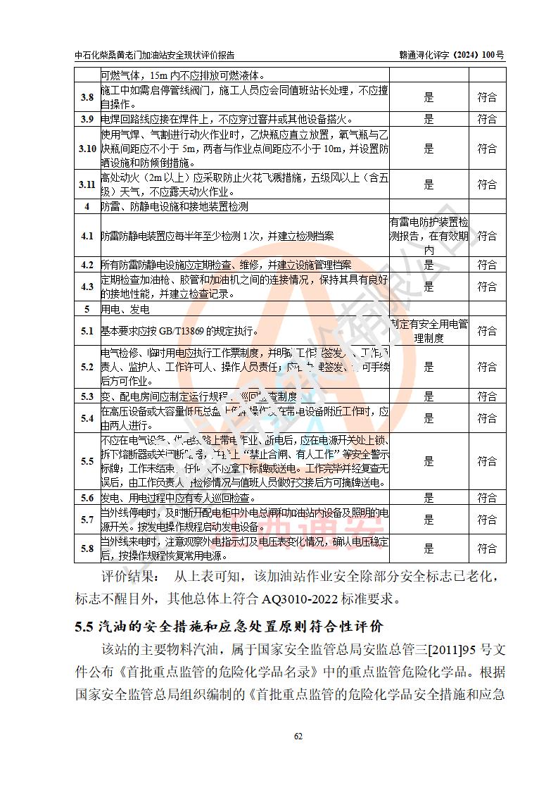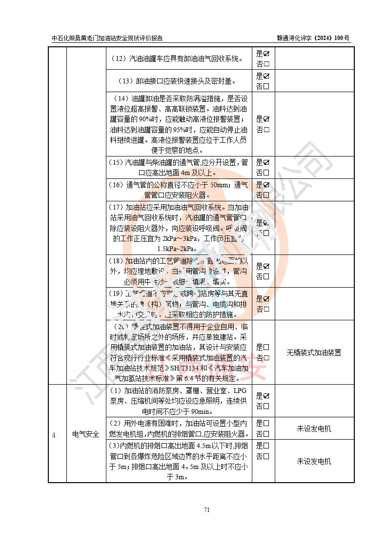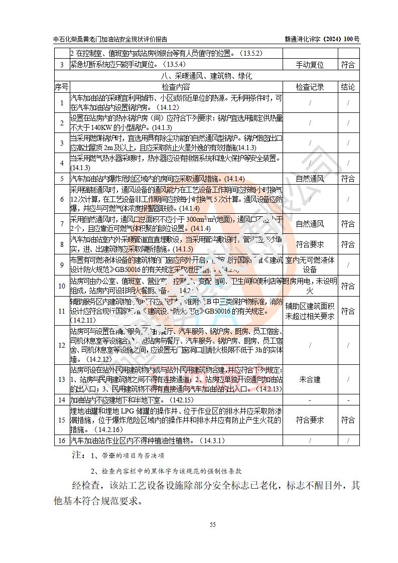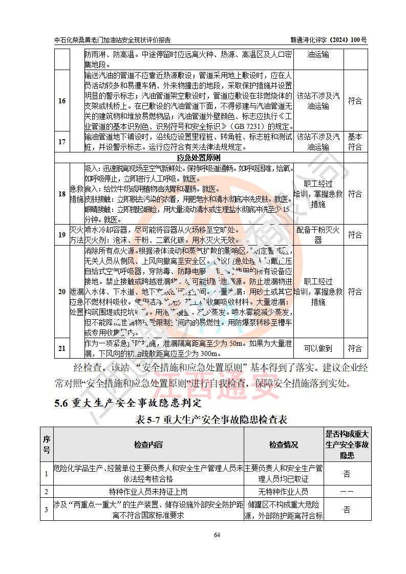 評價結論 | 中國石化銷售股份有限公司江西九江柴桑石油分公司黃老門加油站涉及的安全條件、安全經營條件、安全生產管理符合《危險化學品經營許可證管理辦法》、《汽車加油加氣加氫站技術標準》等**有關法規(guī)、標準、規(guī)范要求,能滿足危險化學品經營安全條件。 | |||